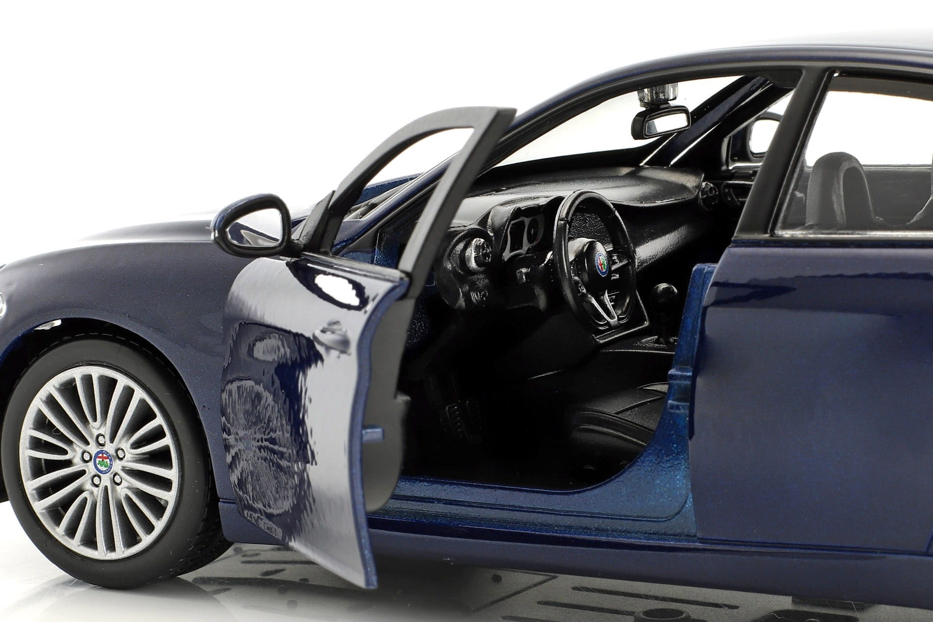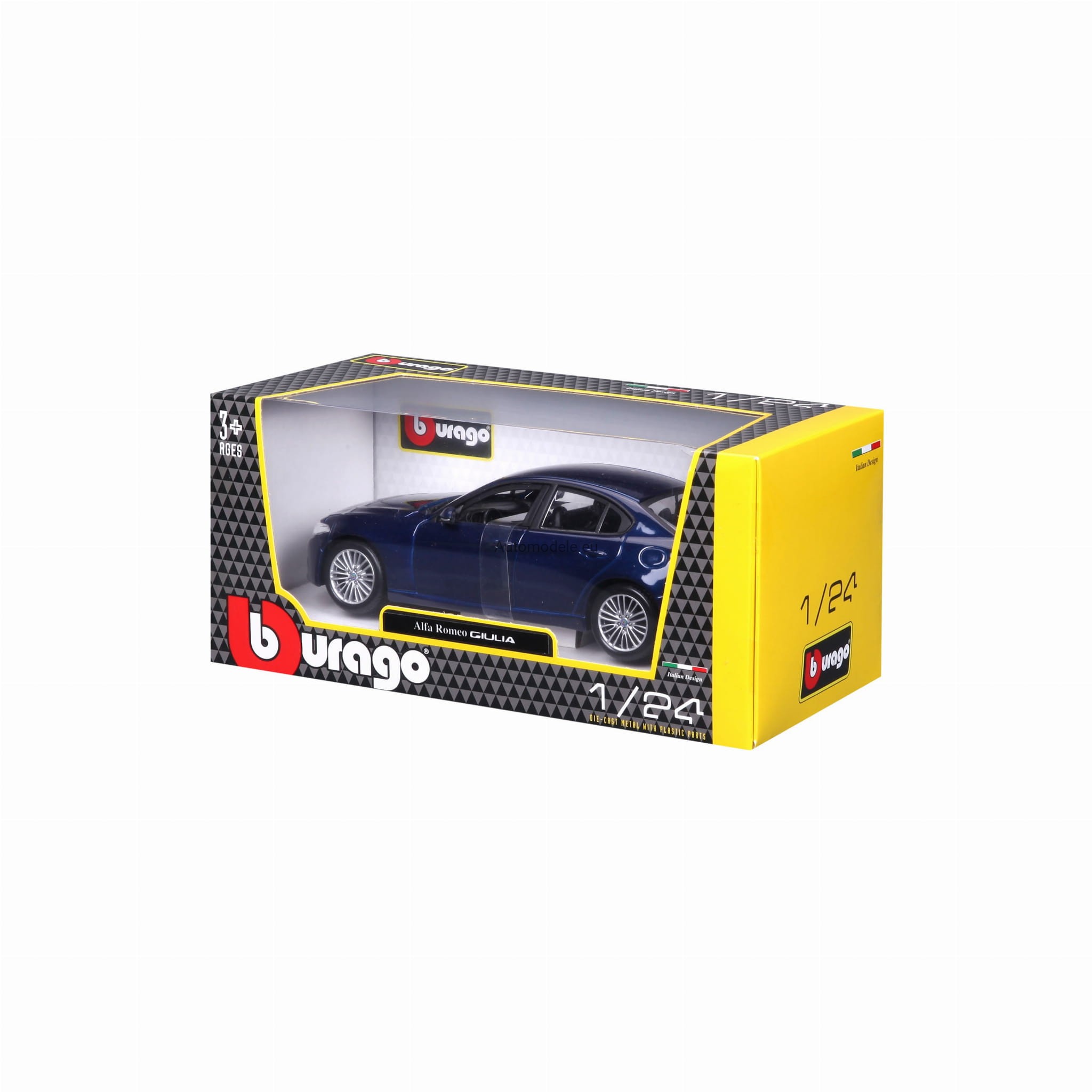 Model samochodu Alfa Romeo Giulia z 2016 roku w skali 1:24 od Bburago. Numer katalogowy: 21080Bu