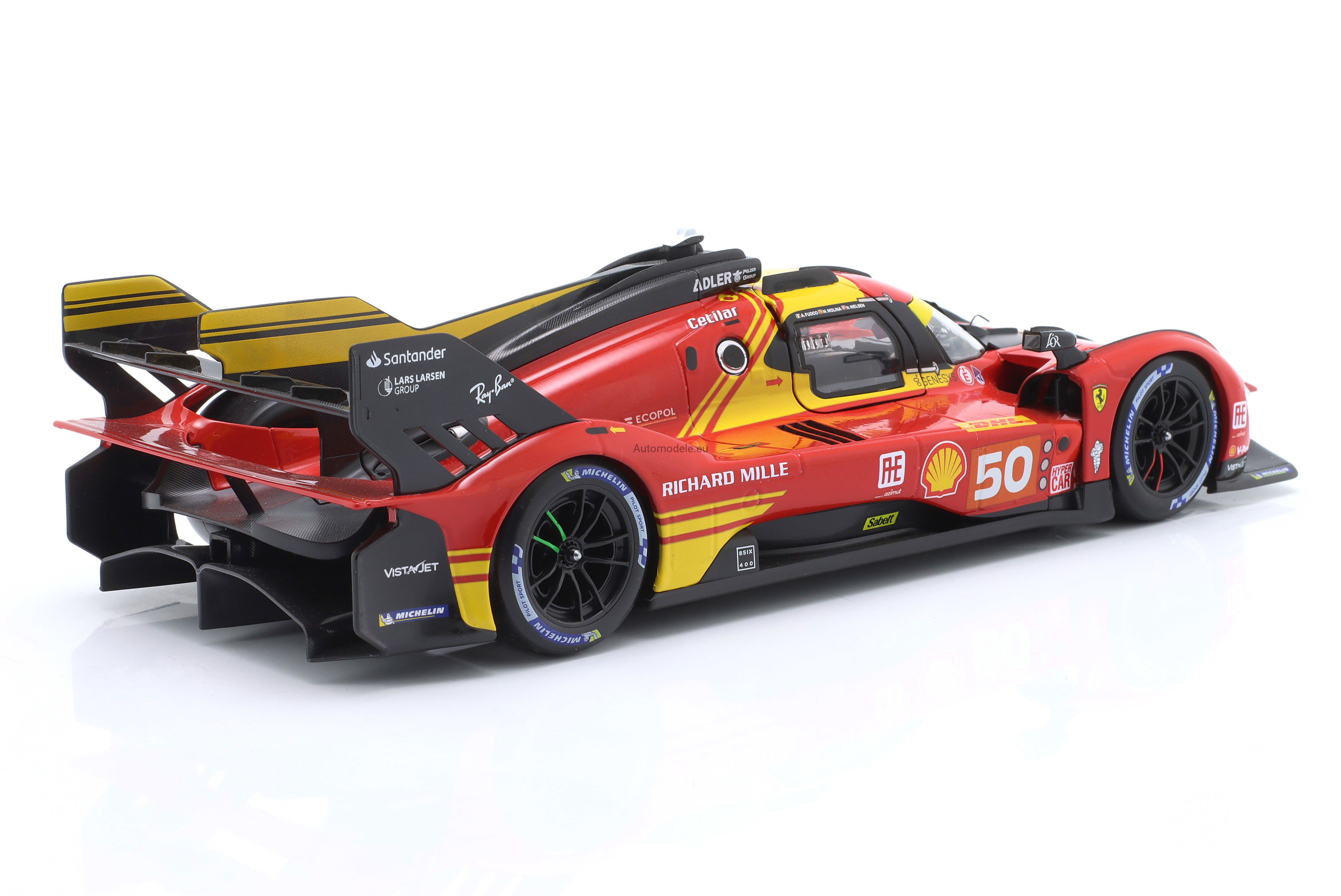 Kolekcjonerski metalowy model samochodu Ferrari 499P 3.0L Turbo V6 #50 6th WEC Qatar - LMH FIA 24h Le Mans Hypercar - Molina, Nielsen, Fuoco z 2024 roku w skali 1:18 od Bburago