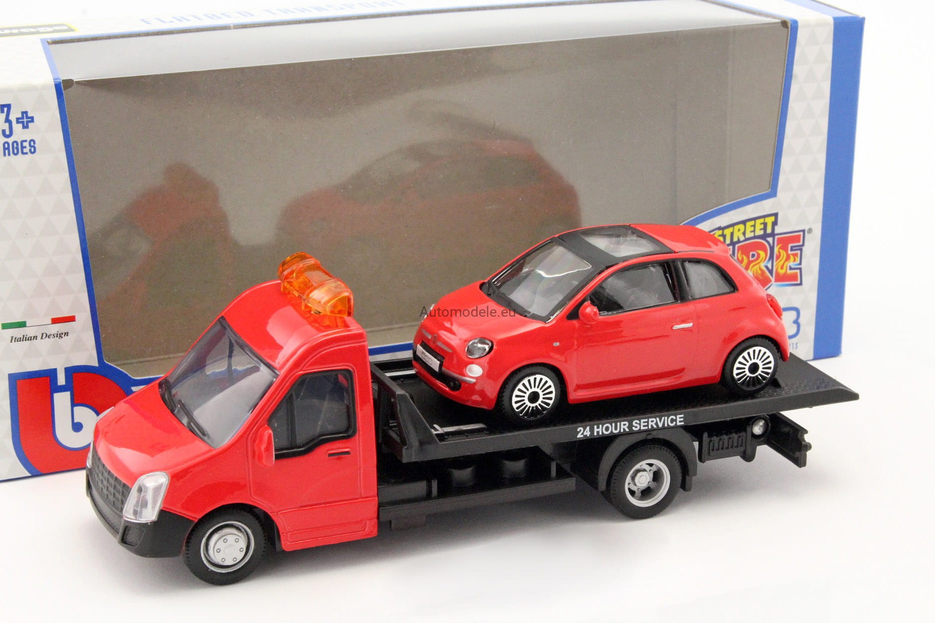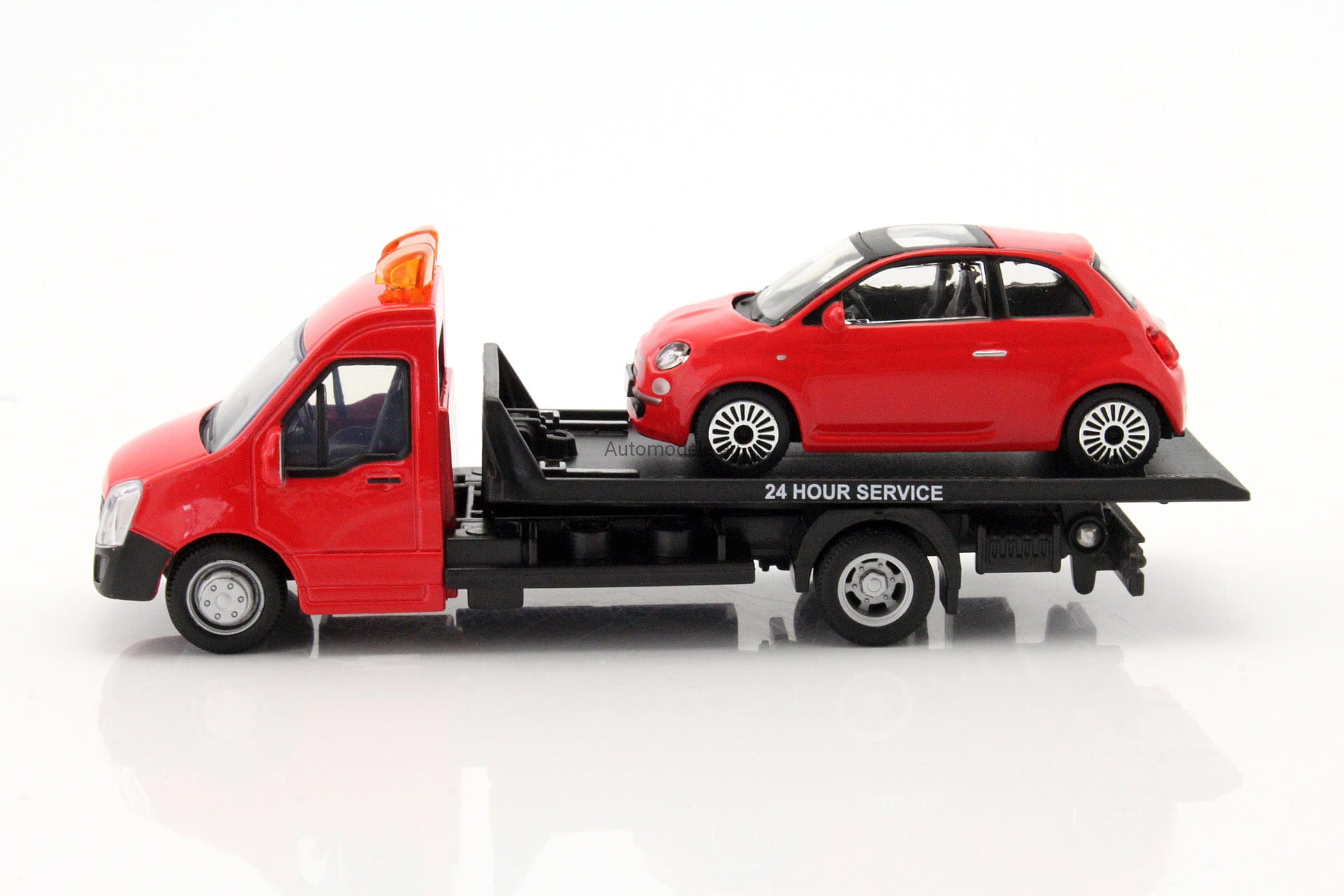 Model samochodu Fiat 500 2007 z Autolawetą Laweta w skali 1:43 od Bburago. Numer katalogowy: 31402