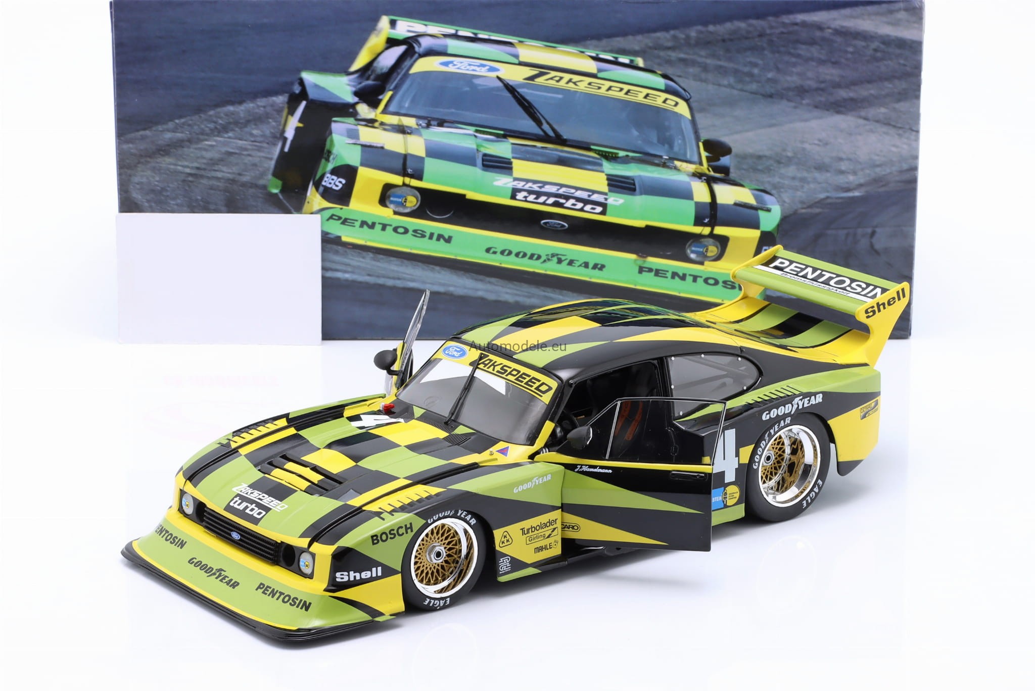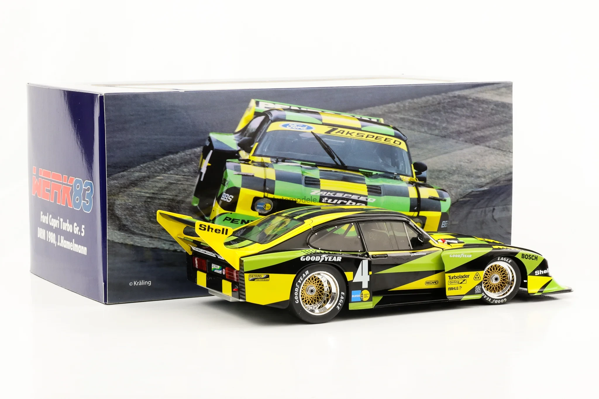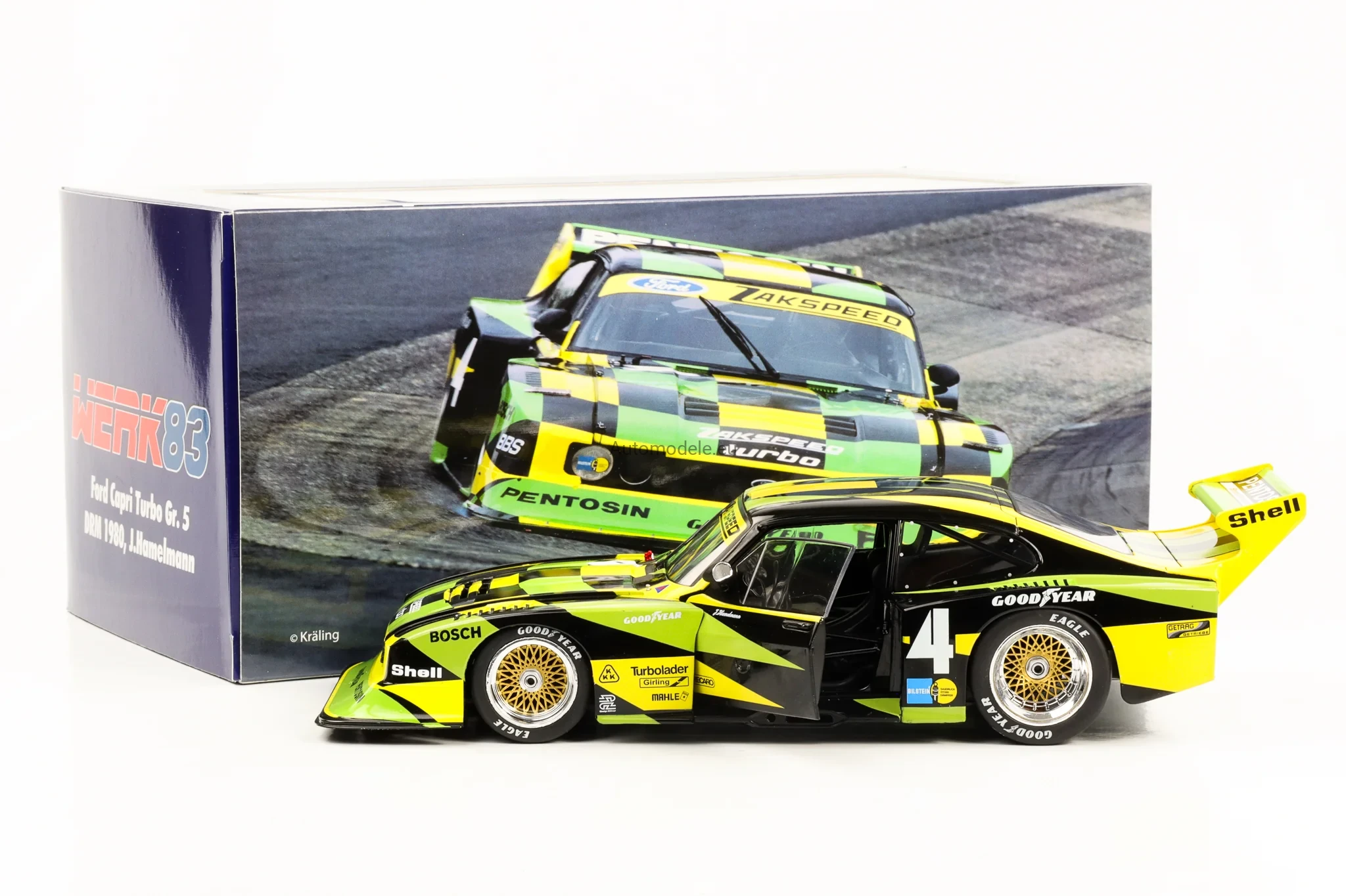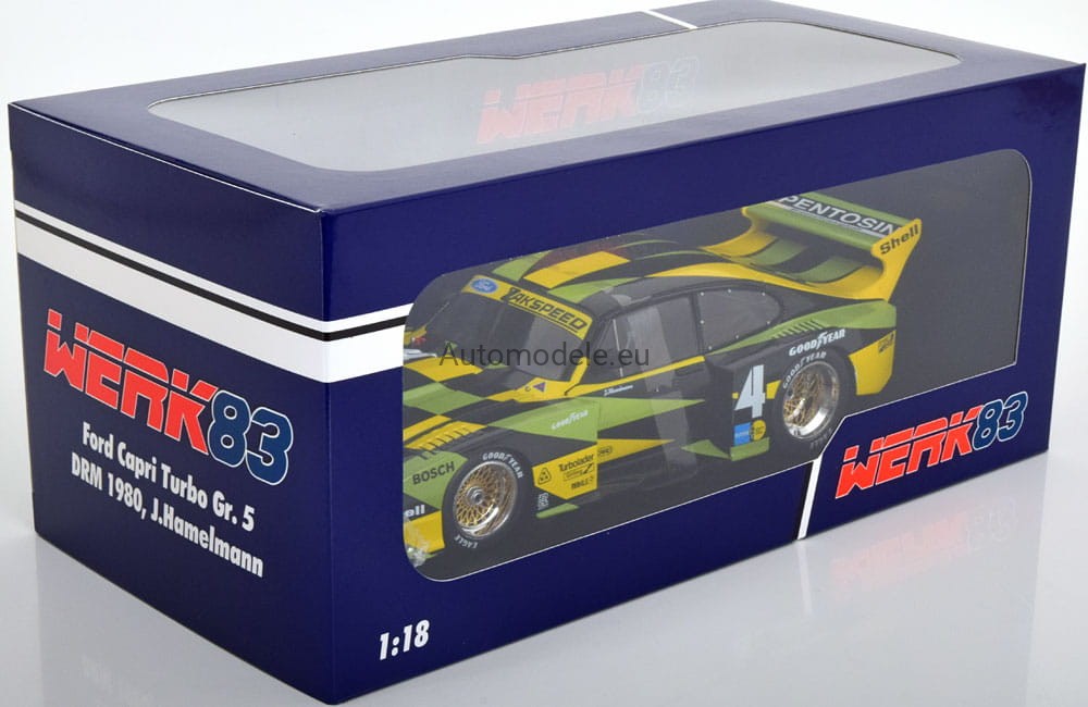 Kolekcjonerski metalowy model samochodu Ford Capri Turbo Gr.5 Gr. Gruppe 5 #4 Zakspeed DRM - Jürgen J. Hamelmann z 1980 roku w skali 1/18 wyprodukowany przez firmę WERK83