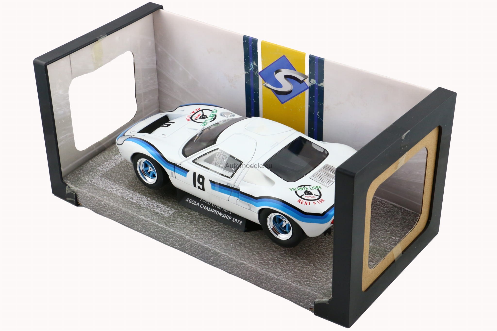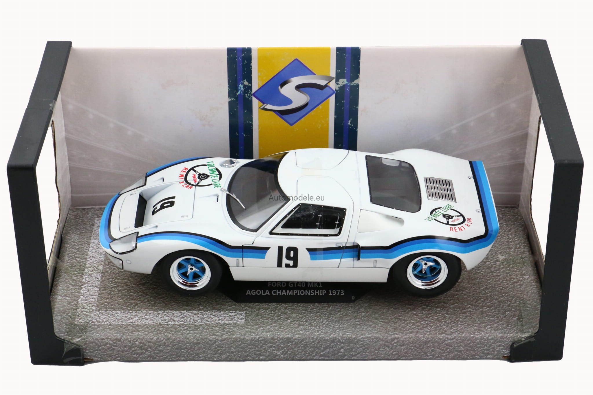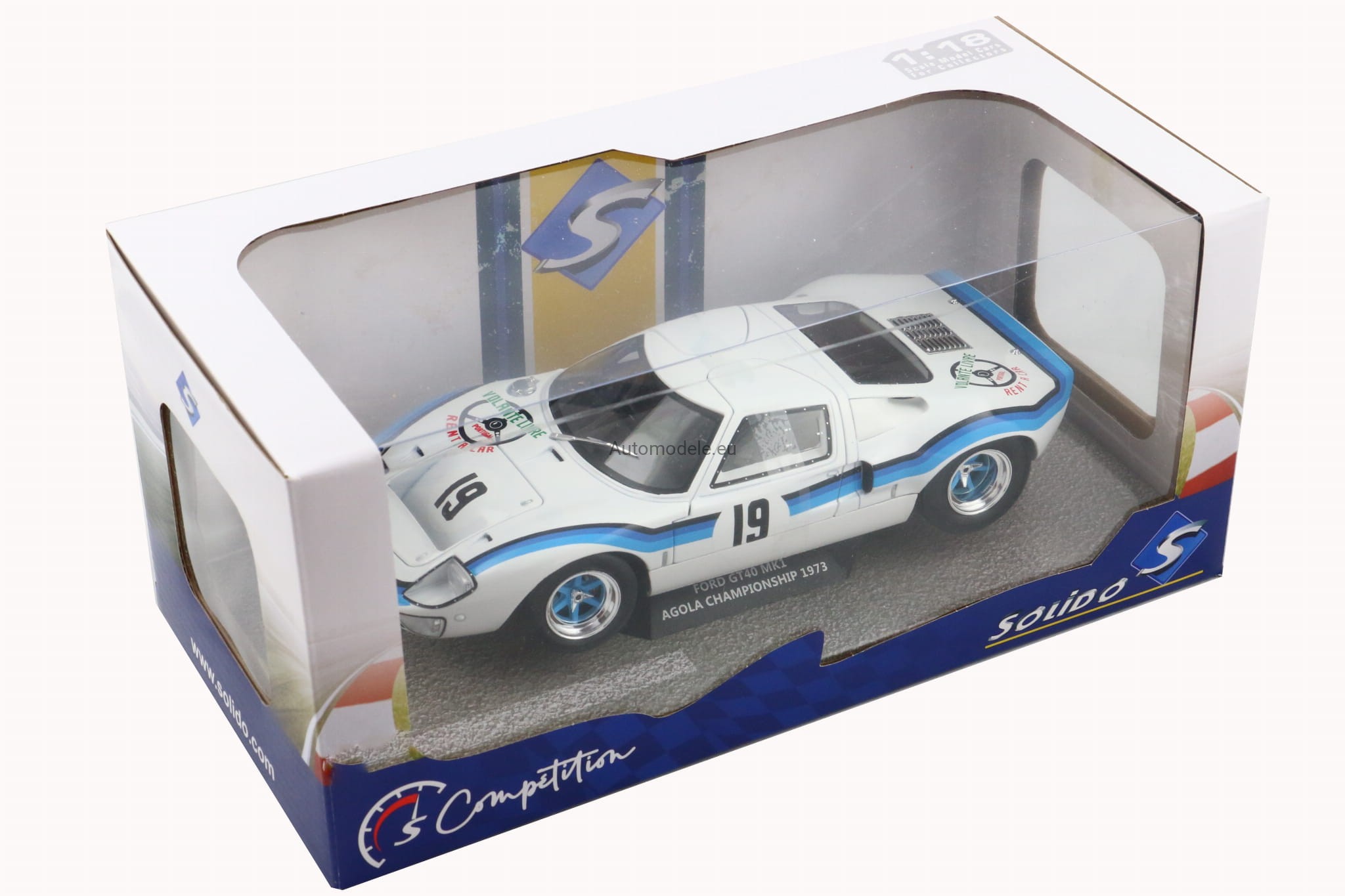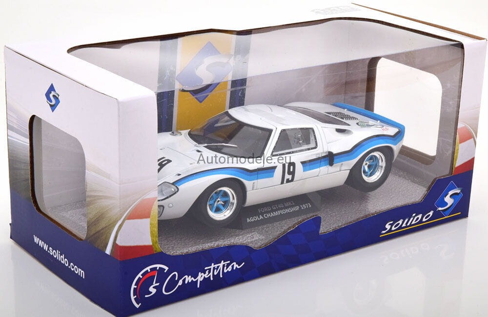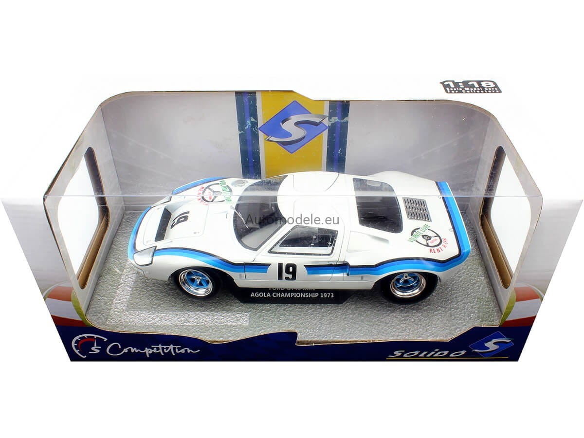 Model samochodu Ford GT40 GT 40 MK I MK1 MK.1 #19 Marta Winner Angola Championship z 1973 roku w skali 1:18 od Solido. Numer katalogowy: S1803006 / SO-1803006 / 421182050