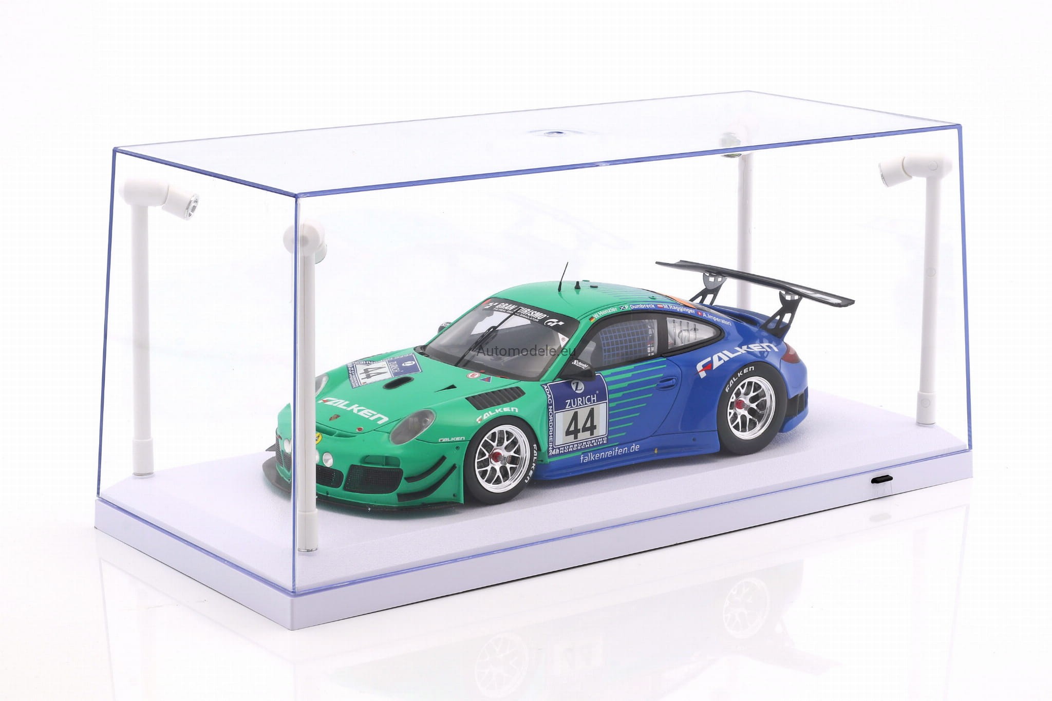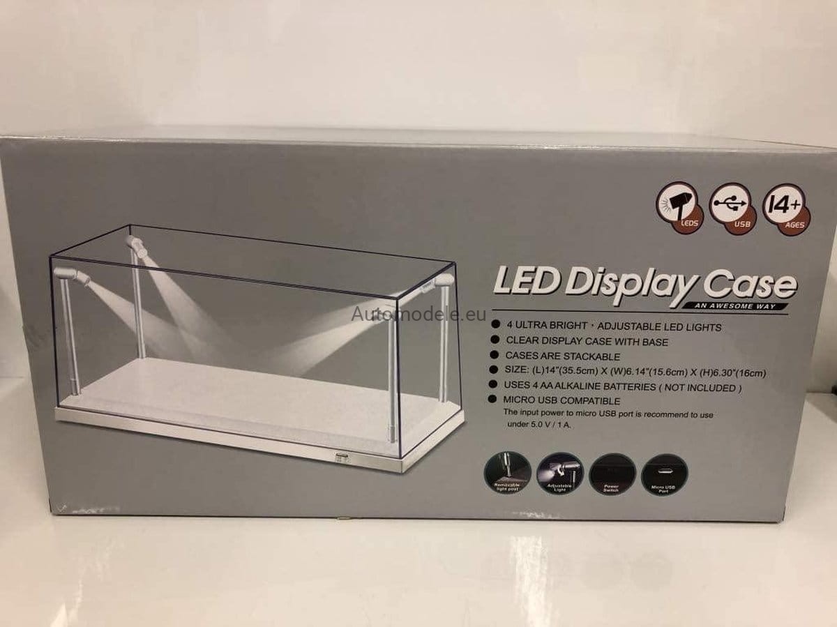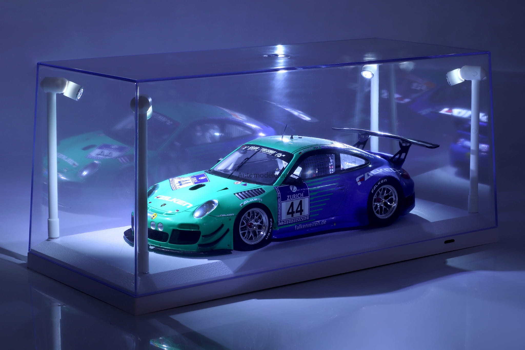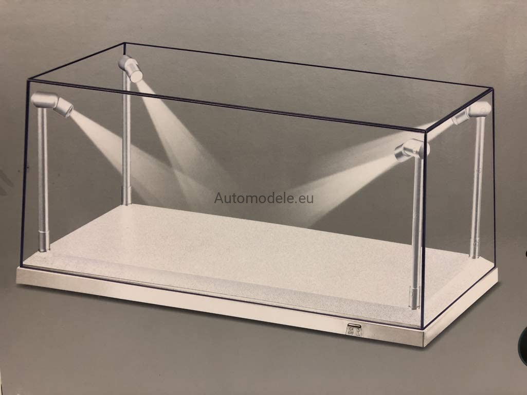 Wysokiej jakości akrylowa gablota na modele samochodów w skali 1:18 z czteropunktowym oświetleniem LED. Producent: Triple9