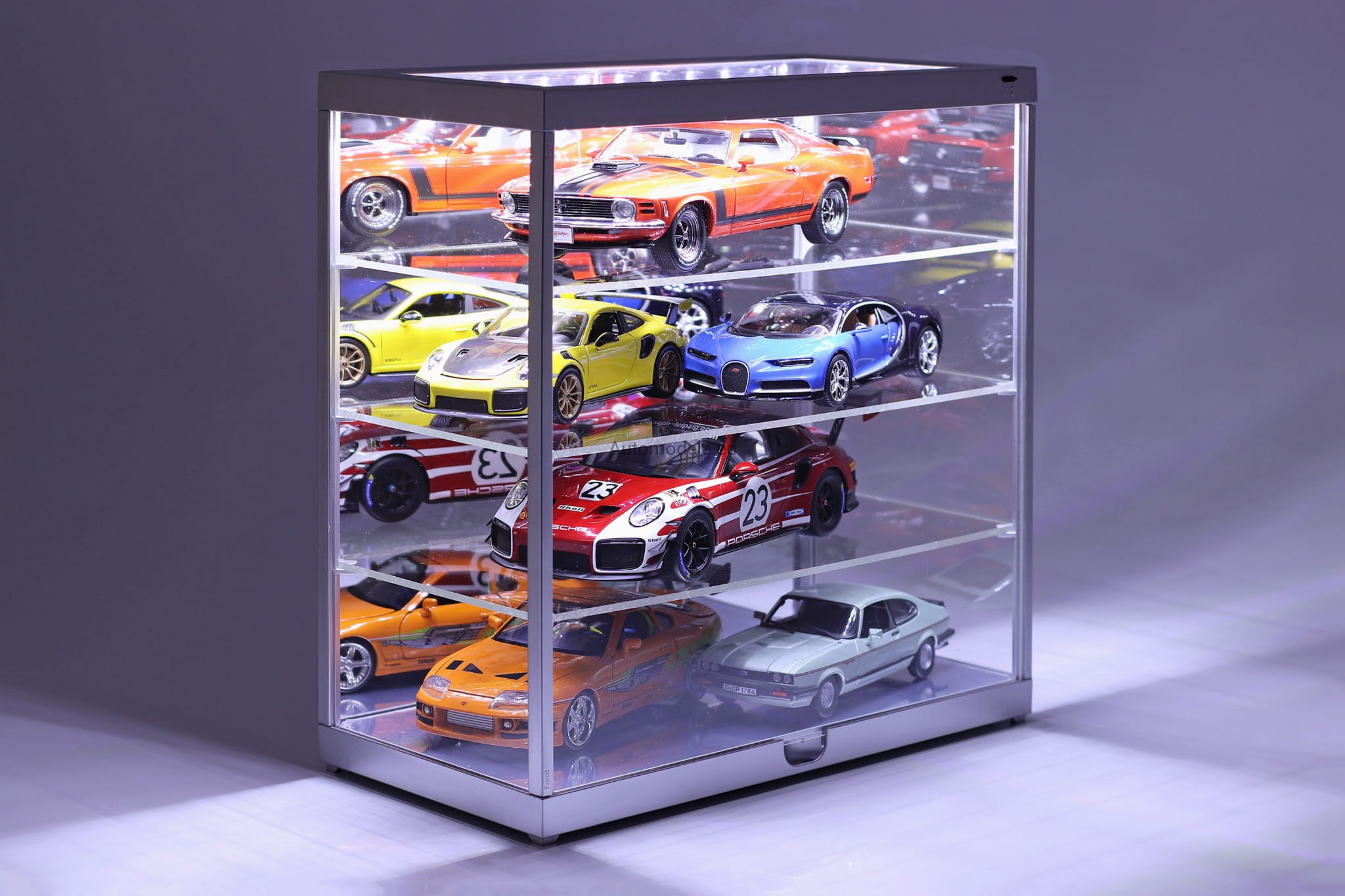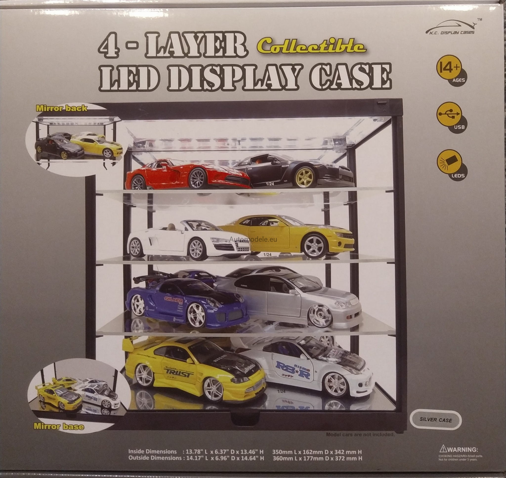 Uniwersalna ekskluzywna 4-poziomowa akrylowa gablotka z oświetleniem LED oraz lustrem do modeli, na modele w różnych skalach. Producent: Triple9 Kod produktu: T9-247840MS Kolor: Srebrny