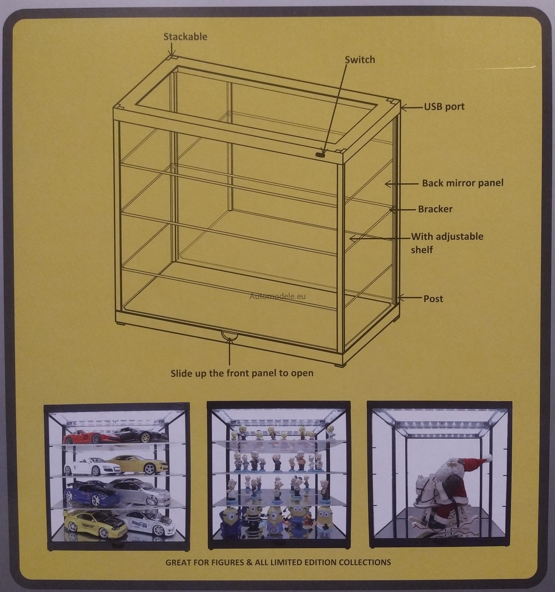 W gablotce można umieścić 4 modele w skali 1:18, lub 8 modeli w skali 1:24 lub kilkanaście modeli w skali 1:43 lub mniejszych.