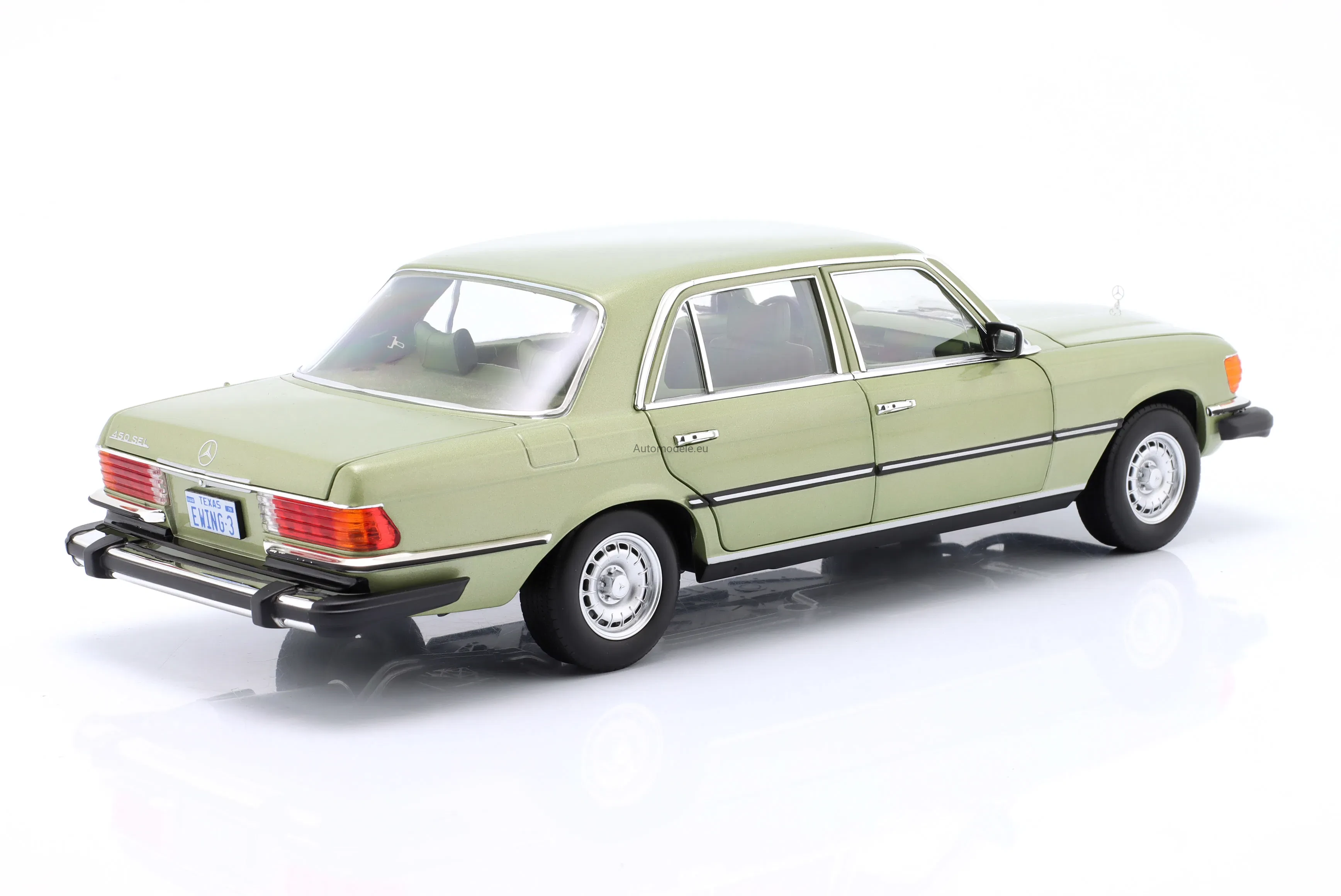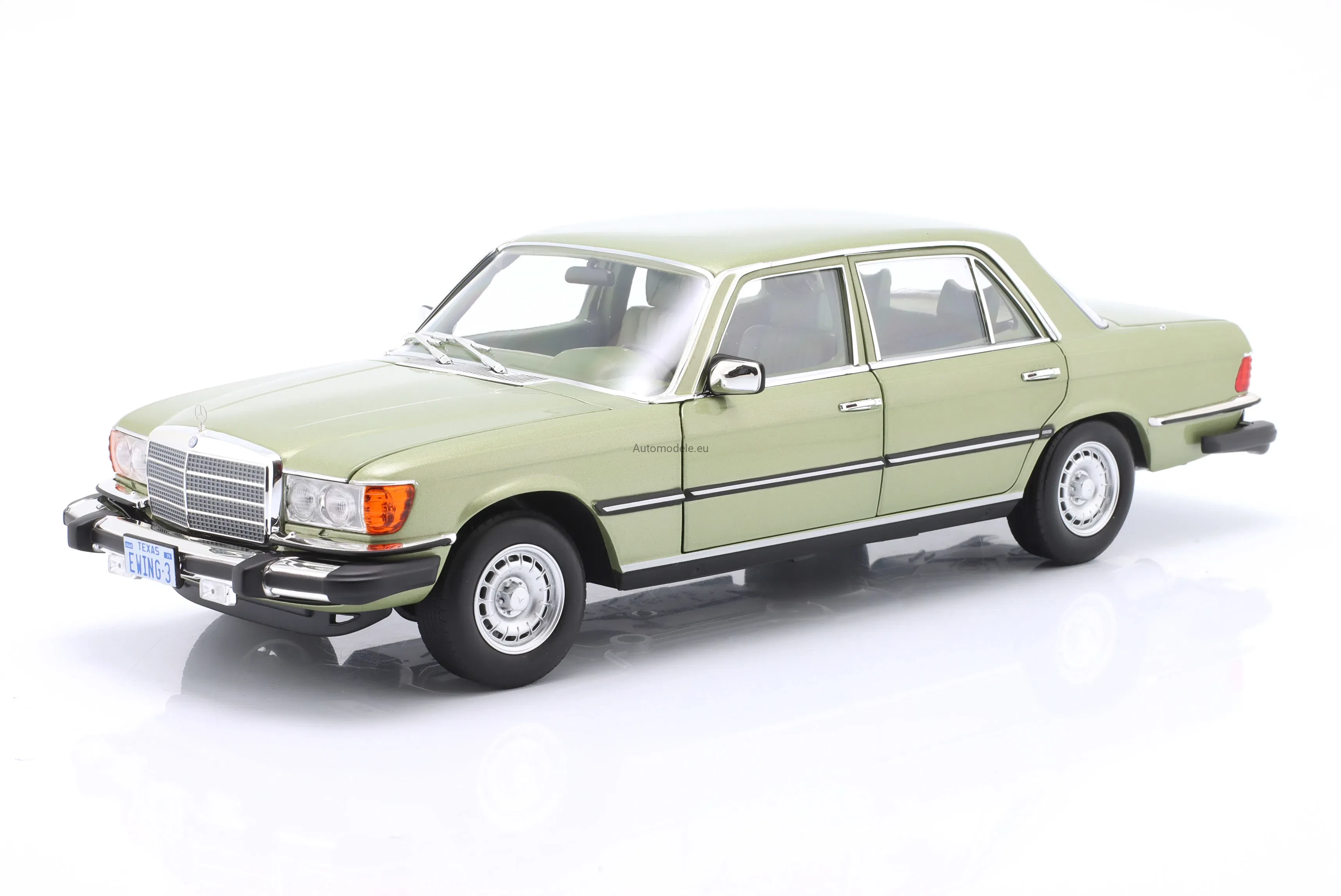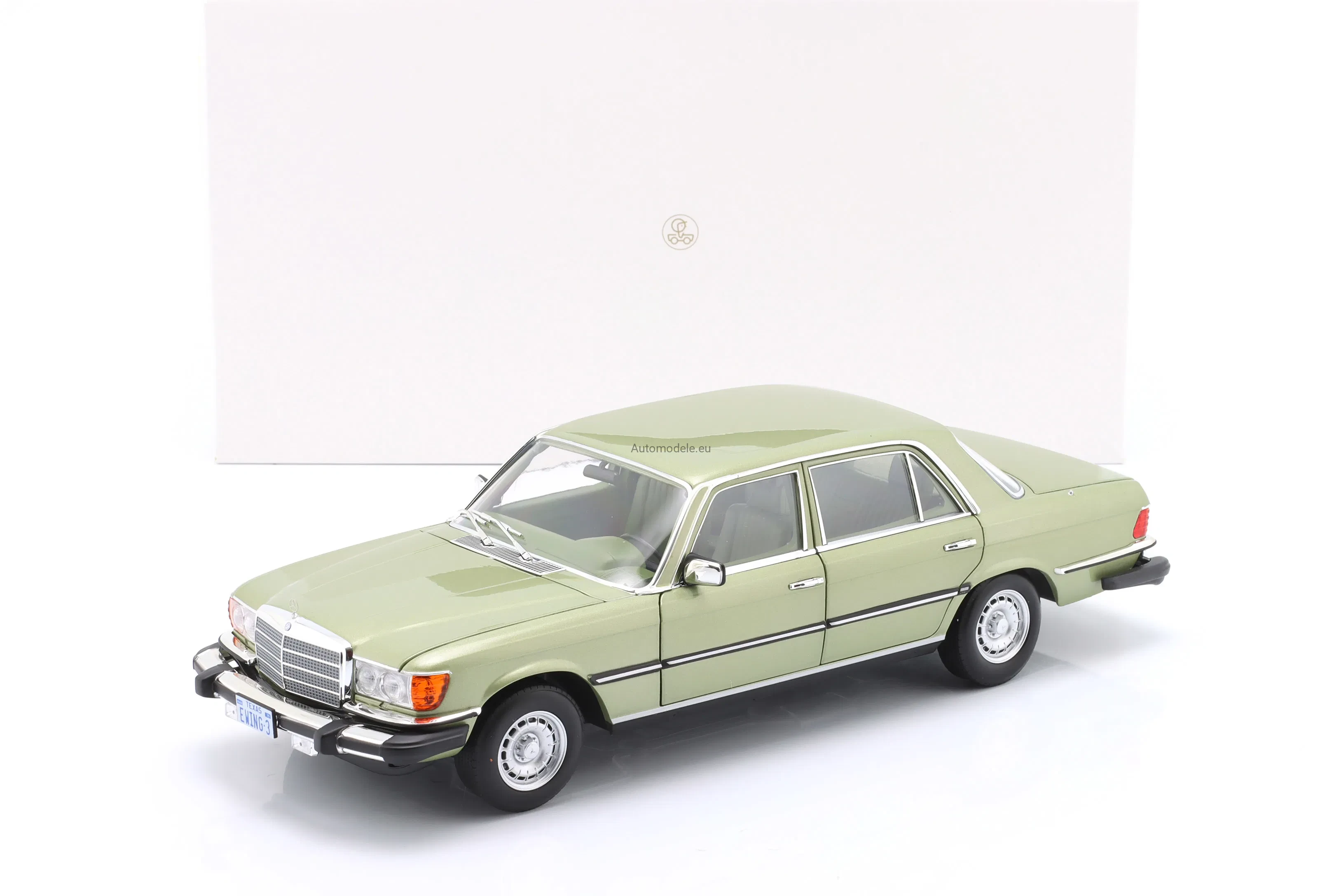 Kolekcjonerski metalowy model samochodu Mercedes-Benz 450 SEL 450SEL 6.9 (W116) W116 US Version - TV Series Dallas S-Class Sedan z 1979 roku w skali 1/18 wyprodukowany przez firmę Norev