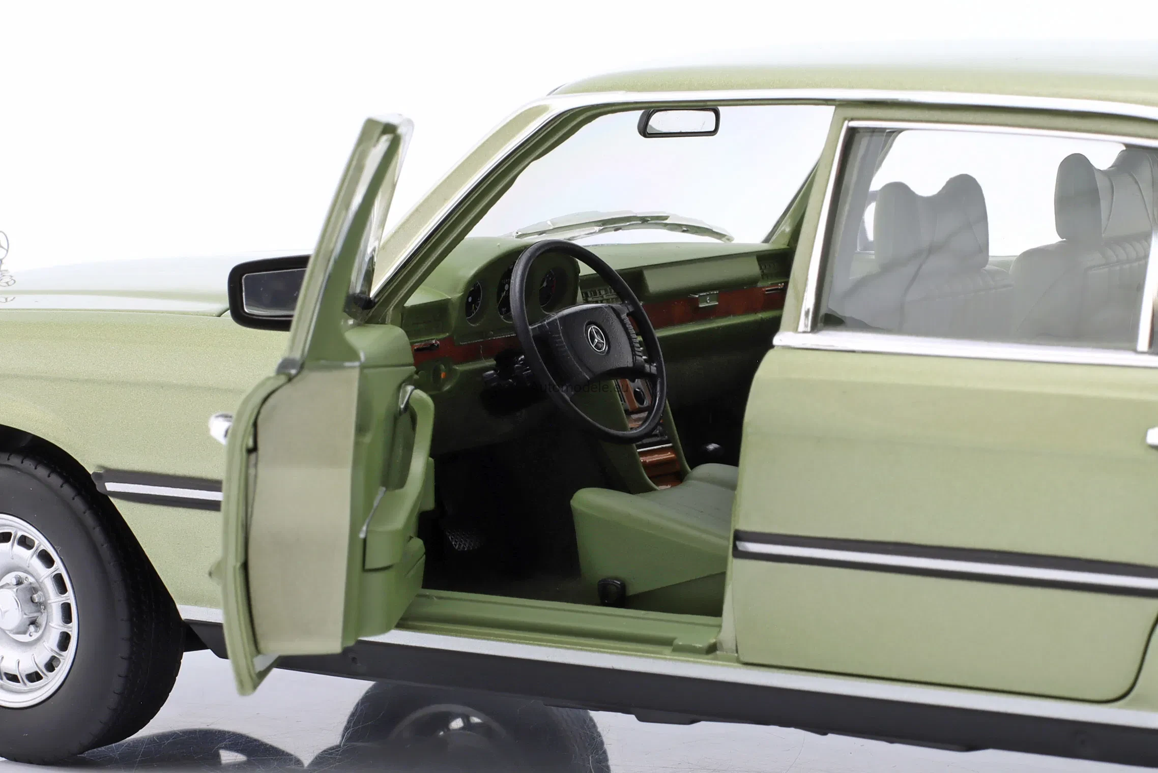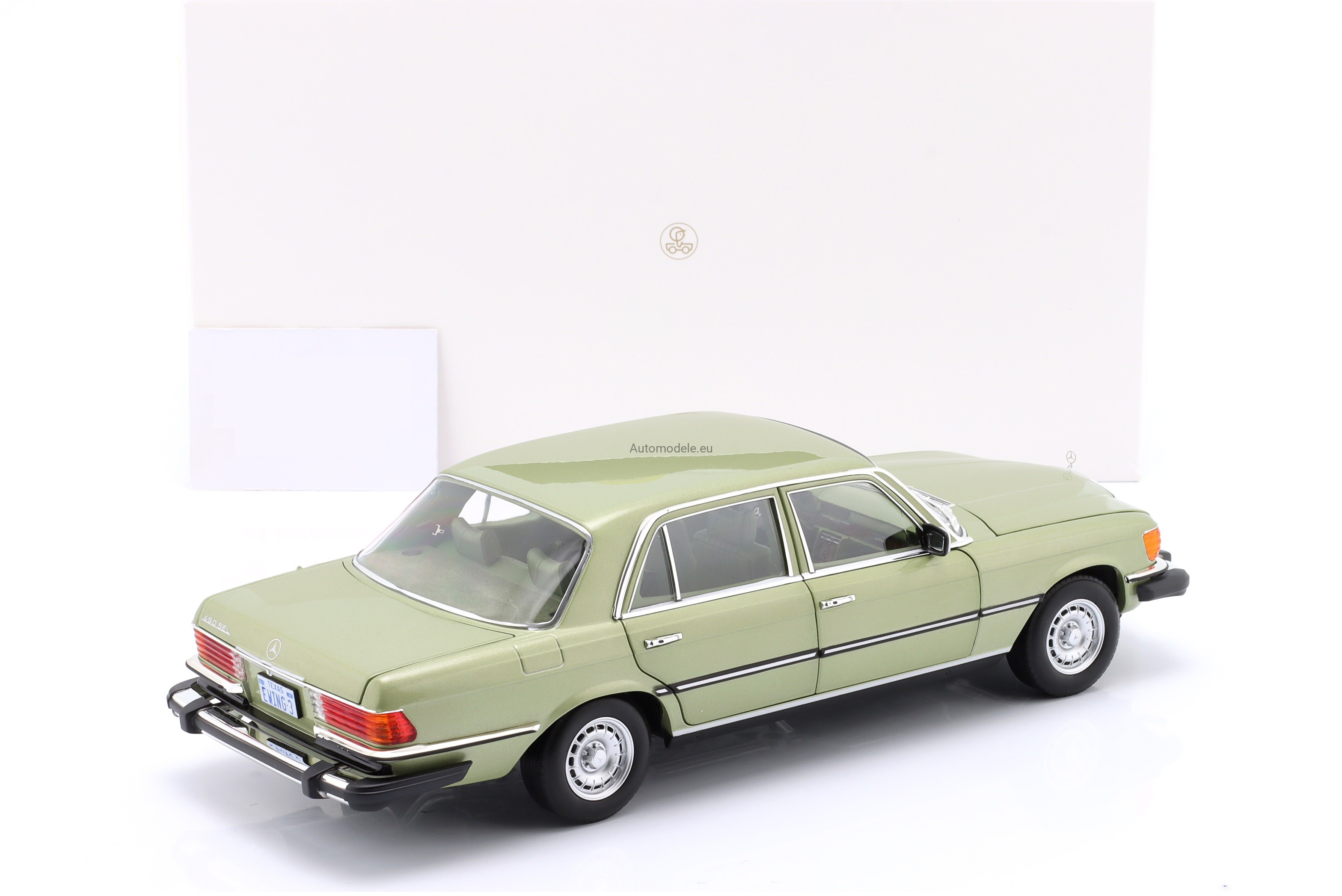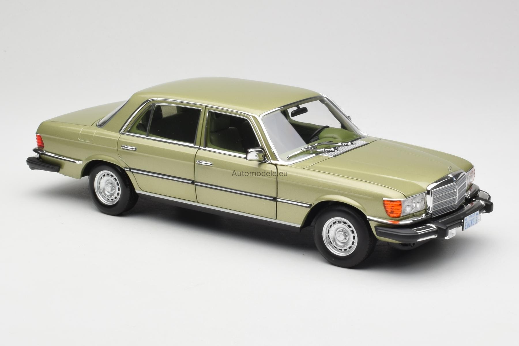 Kolekcjonerski metalowy model samochodu Mercedes-Benz 450 SEL 450SEL 6.9 (W116) W116 US Version - TV Series Dallas S-Class Sedan z 1979 roku w skali 1/18 wyprodukowany przez firmę Norev