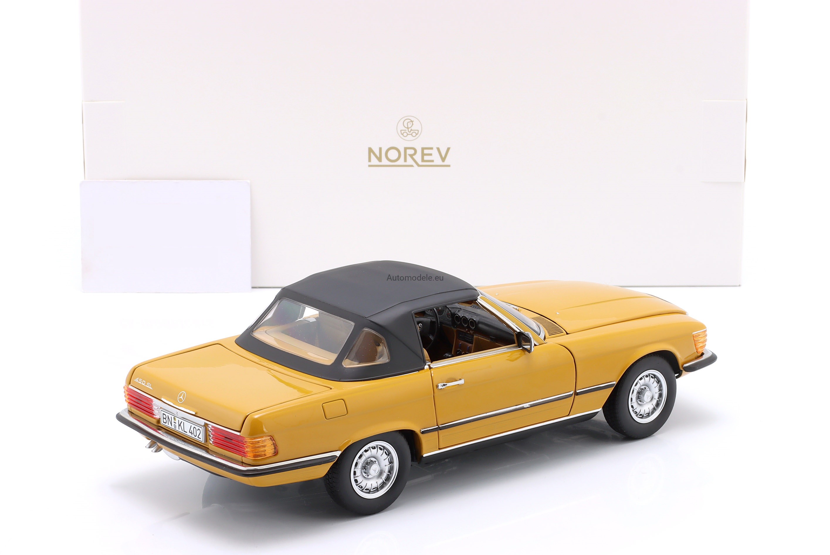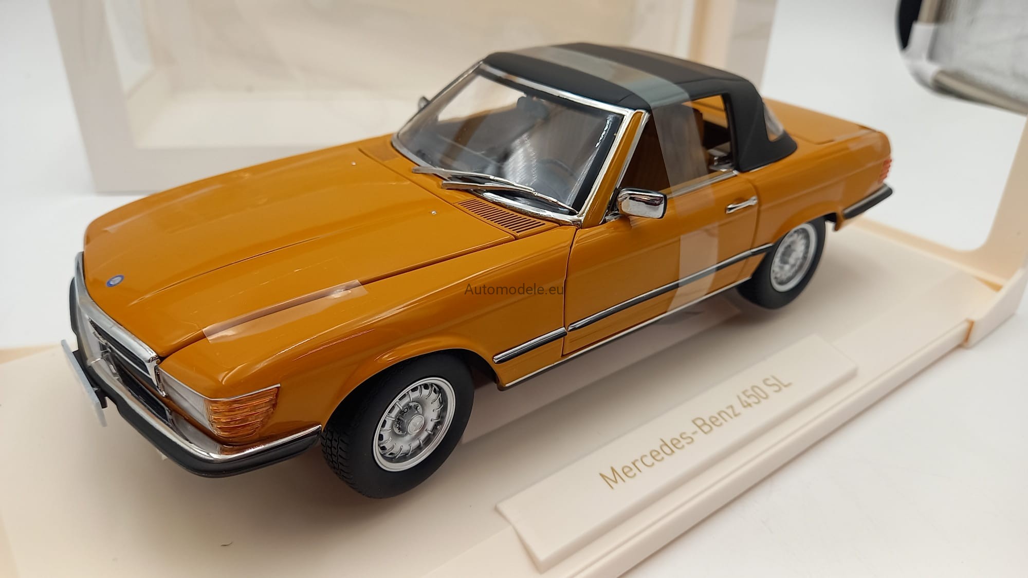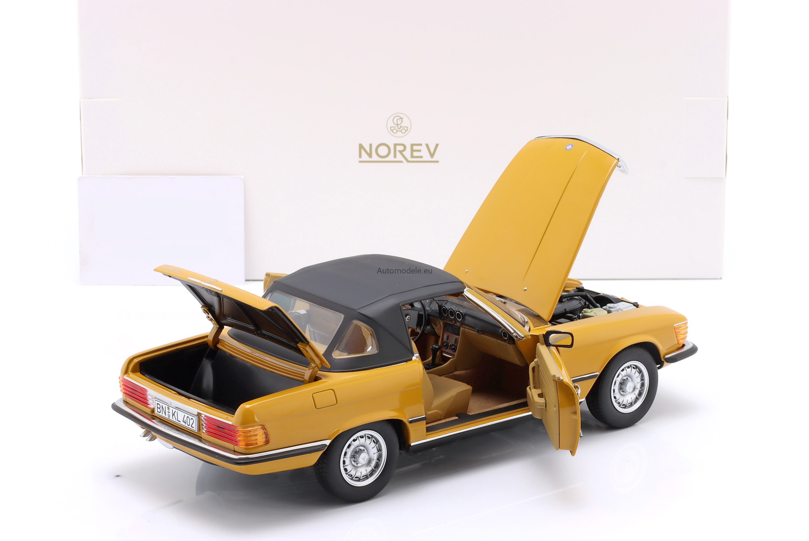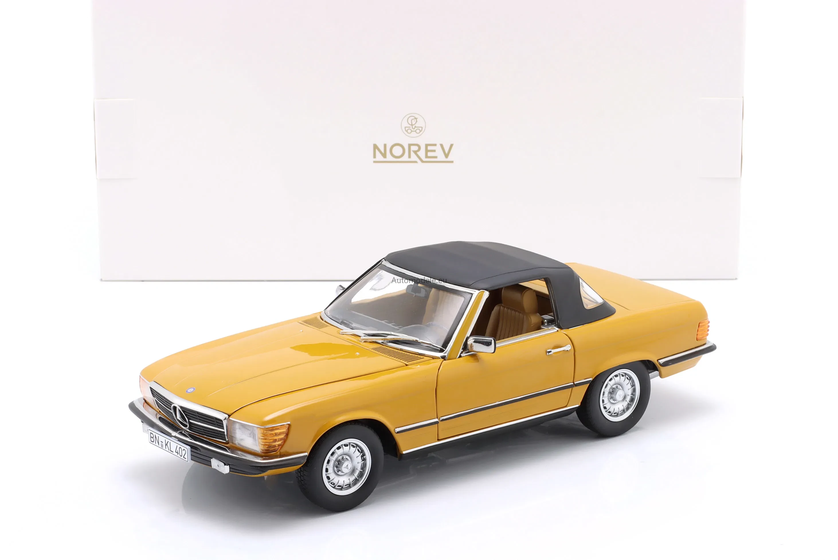 Kolekcjonerski metalowy model samochodu Mercedes-Benz Mercedes MB 450 SL 450SL SL450 (R107) R107 SL-Class Cabriolet Spider Convertible Roadster z 1975 roku w skali 1/18 wyprodukowany przez firmę Norev