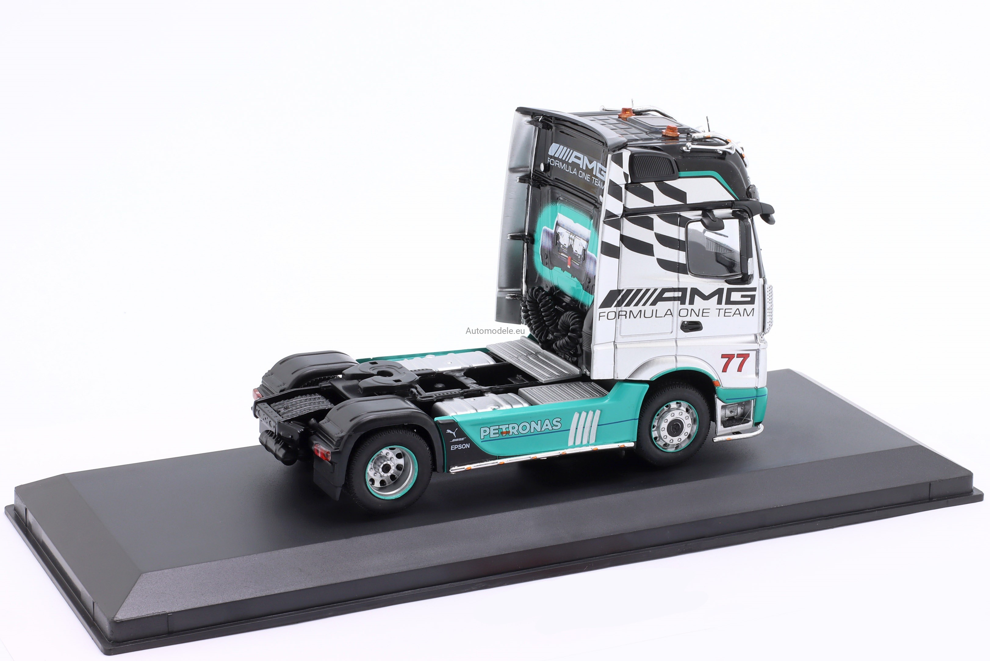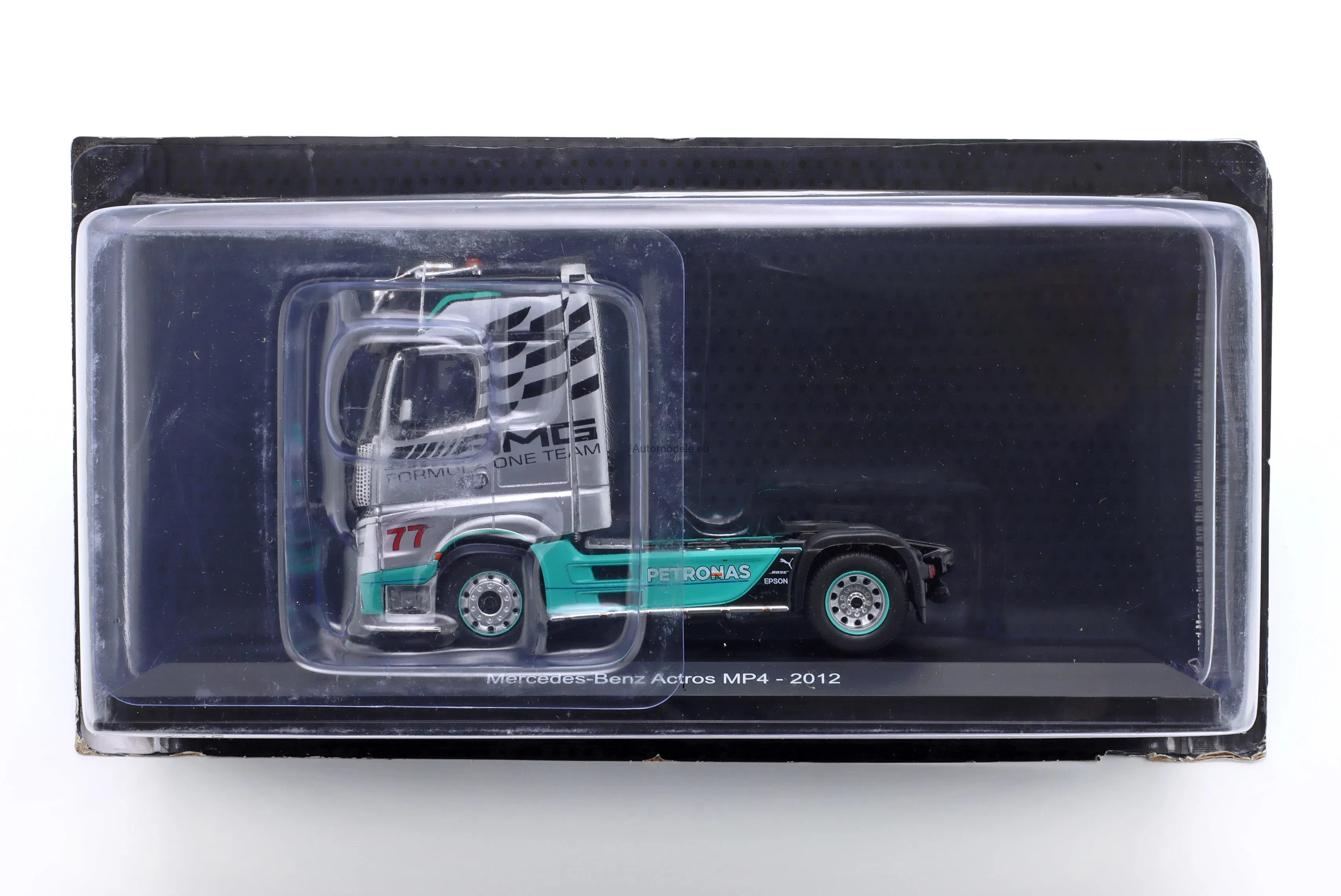 Kolekcjonerski model samochodu Mercedes-Benz Actros MP4 4x2 #77 Tractor Truck - AMG Petronas F1 Team z 2012 roku w skali 1/43 wyprodukowany przez firmę Hachette