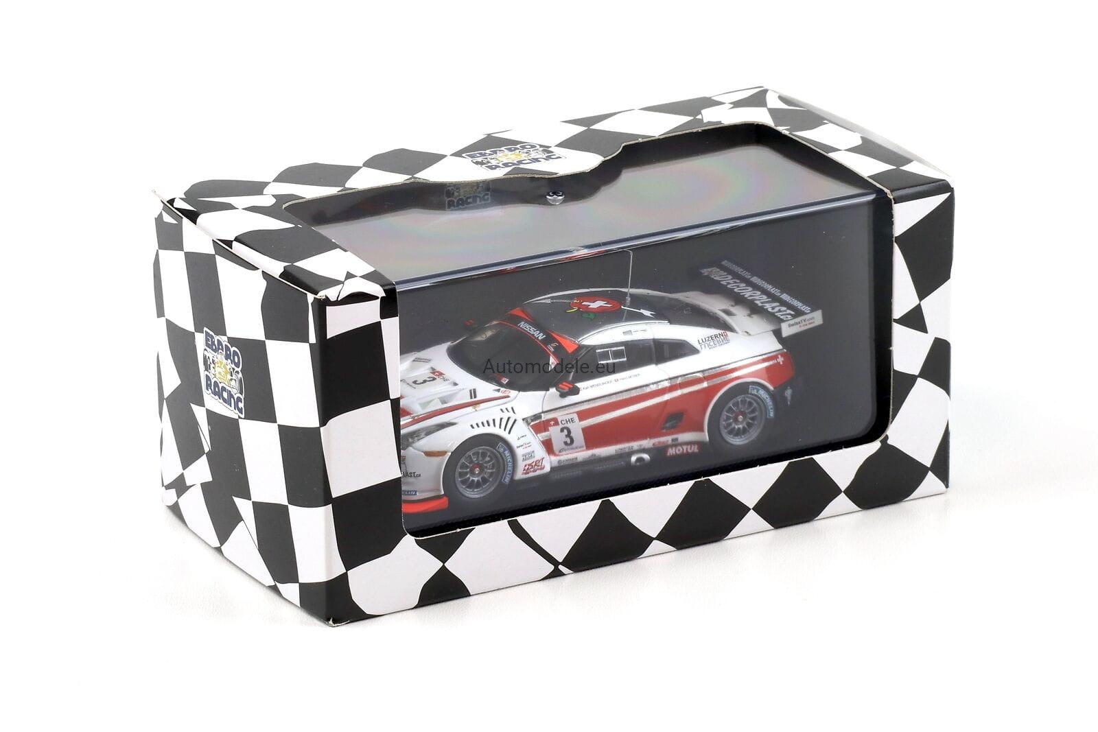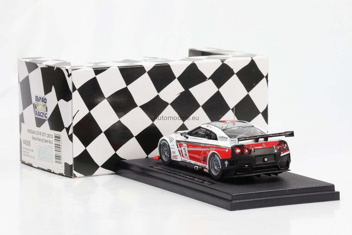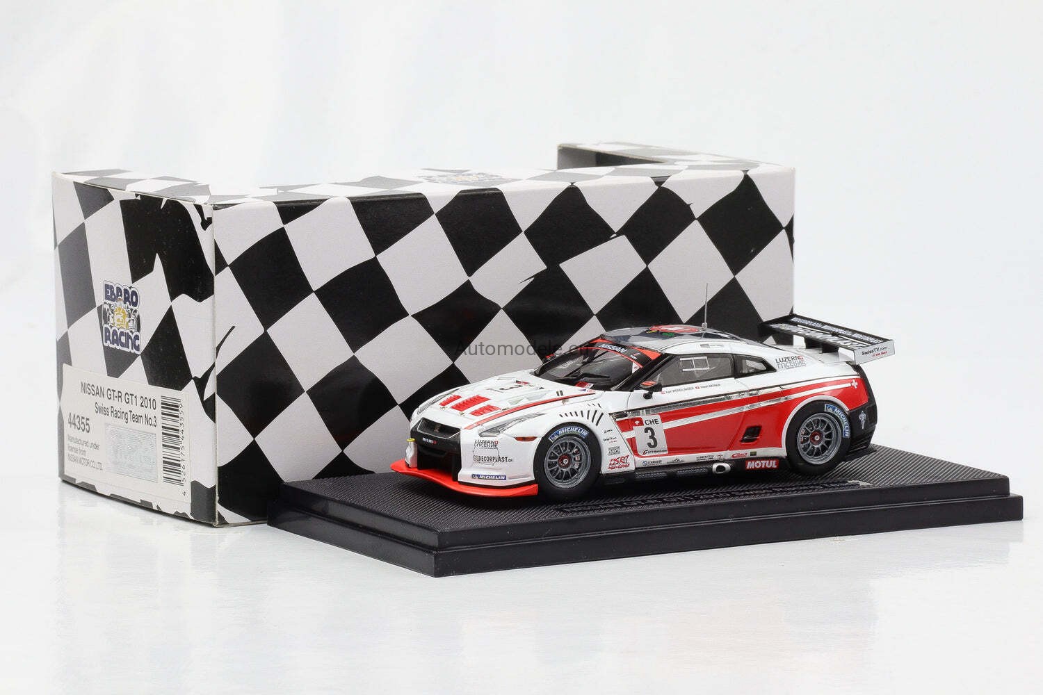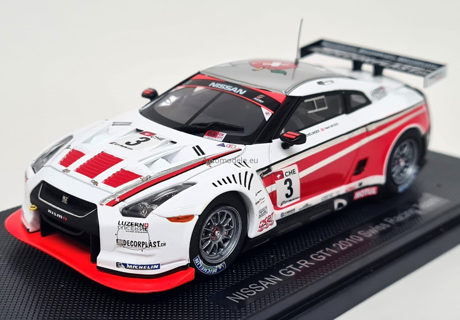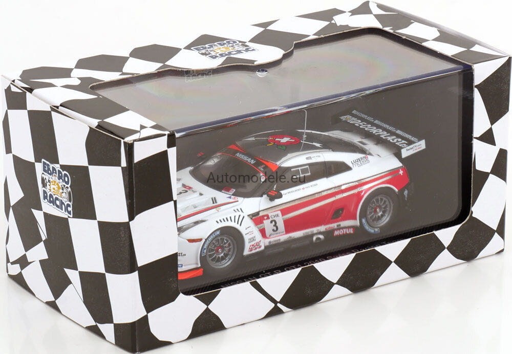 Kolekcjonerski model samochodu Nissan GT-R GTR R35 GT1 Swiss Racing Team #3 FIA GT Championship - Wendlinger, Moser z 2010 roku w skali 1:43 od Ebbro