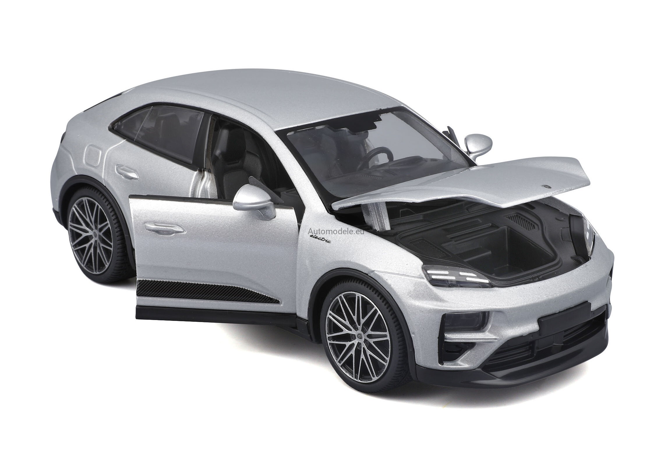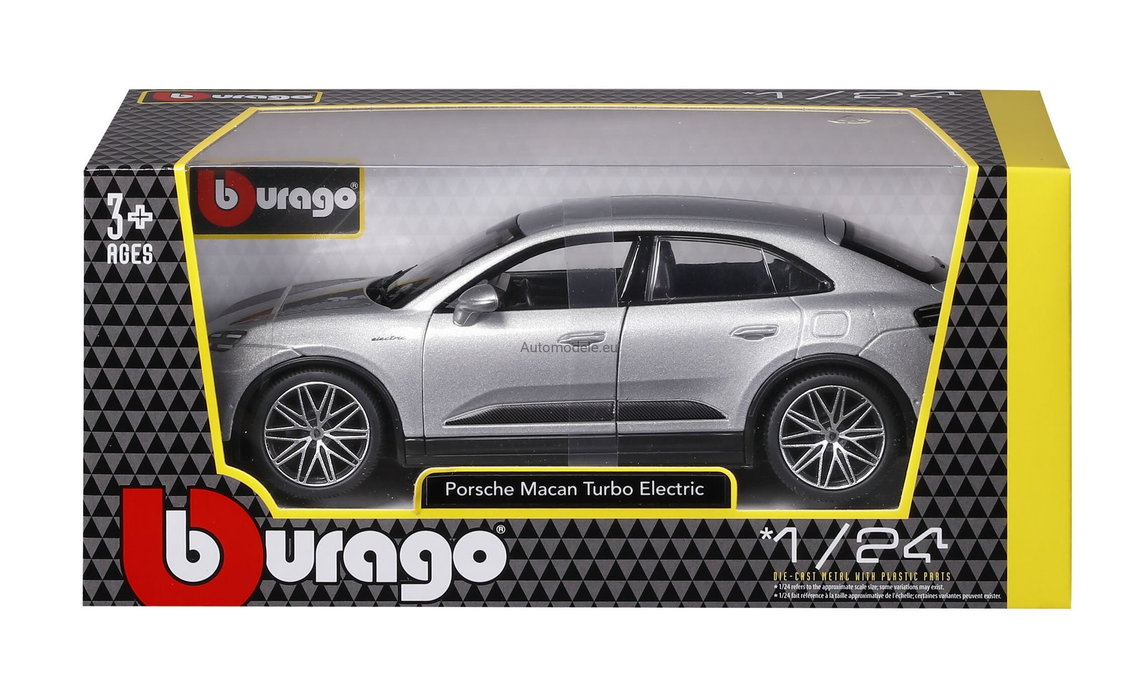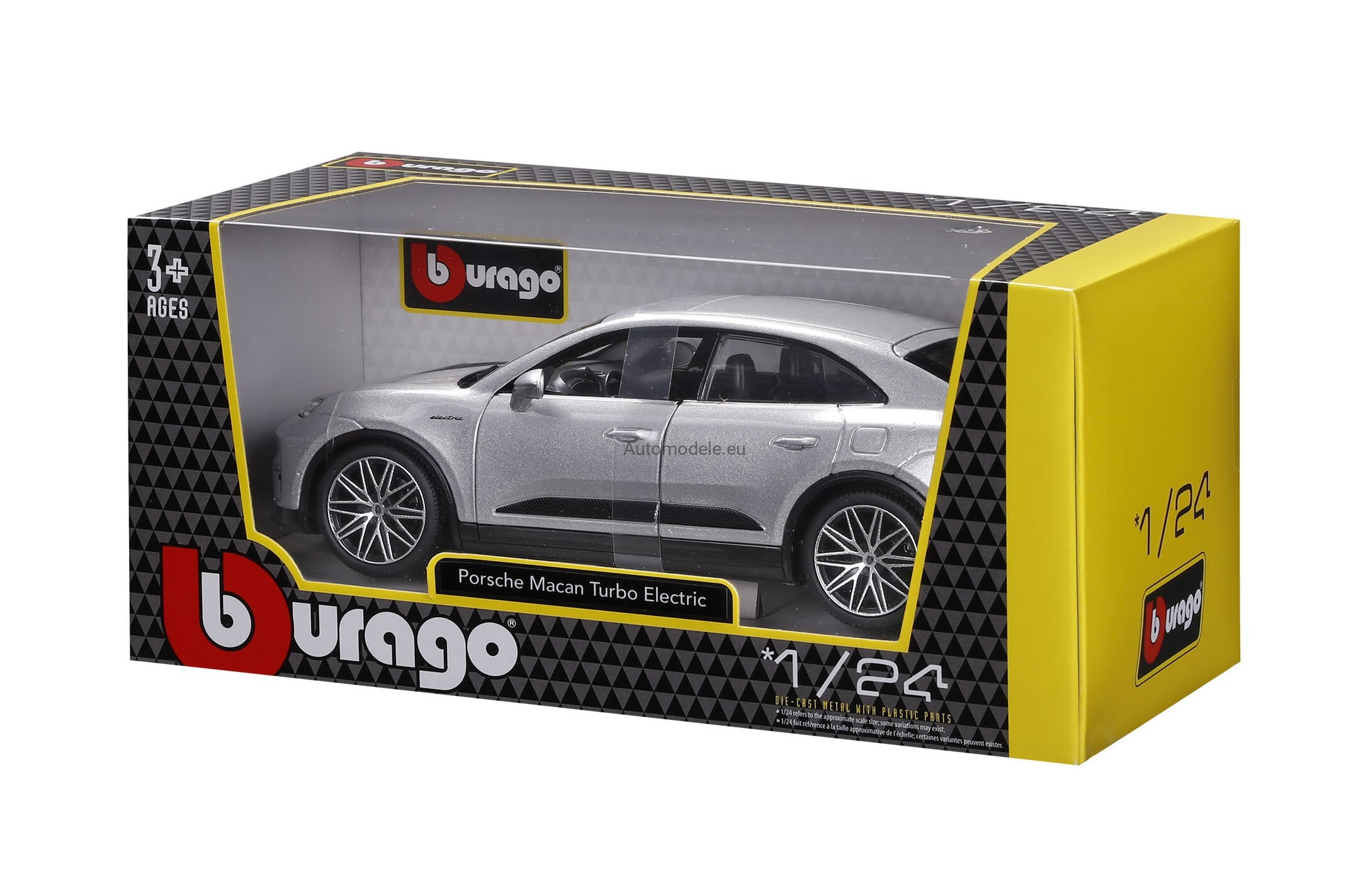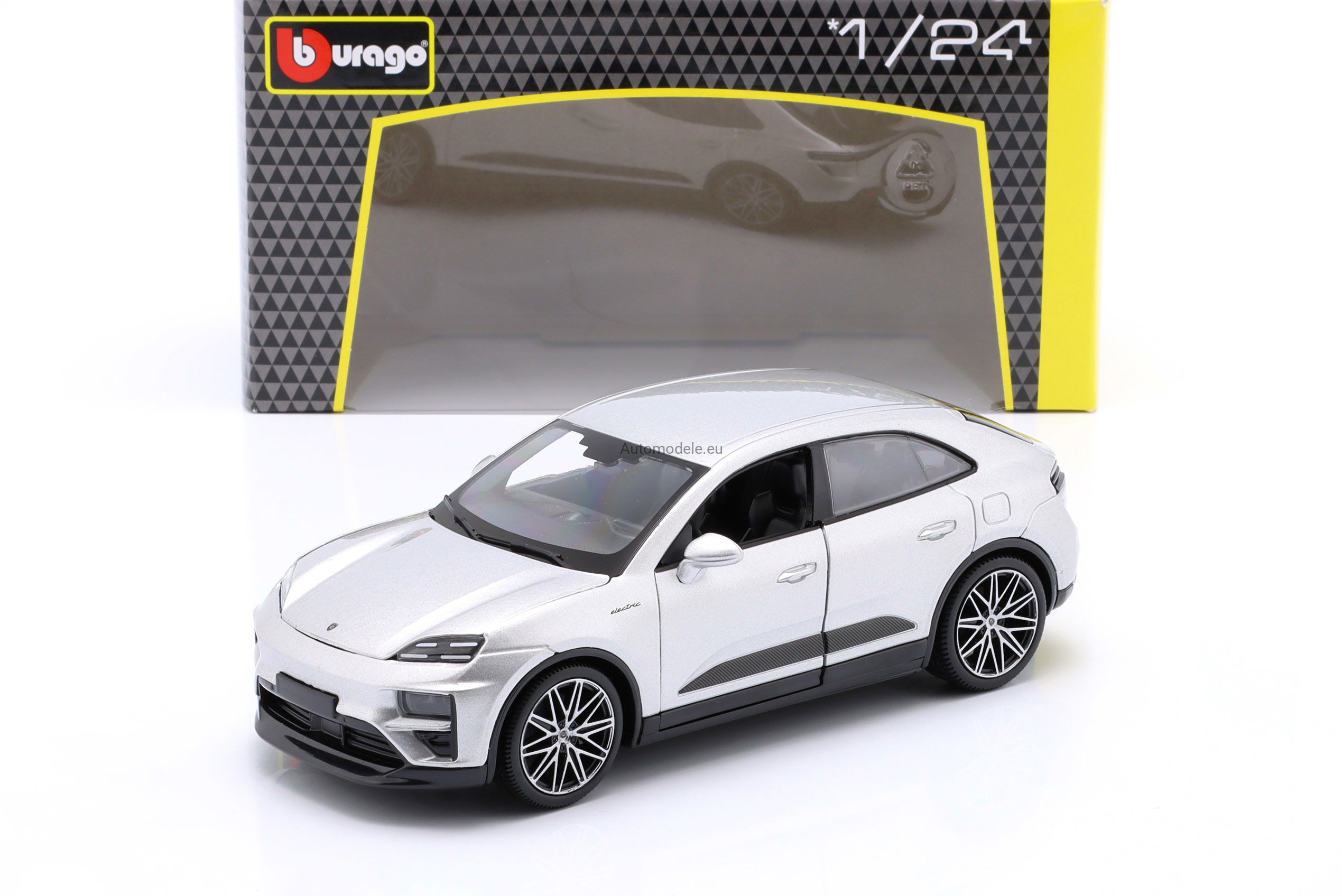Kolekcjonerski metalowy model samochodu Porsche Macan 4 Turbo Electric z 2024 roku w skali 1:24, wyprodukowany przez znaną, cenioną i renomowaną firmę Bburago