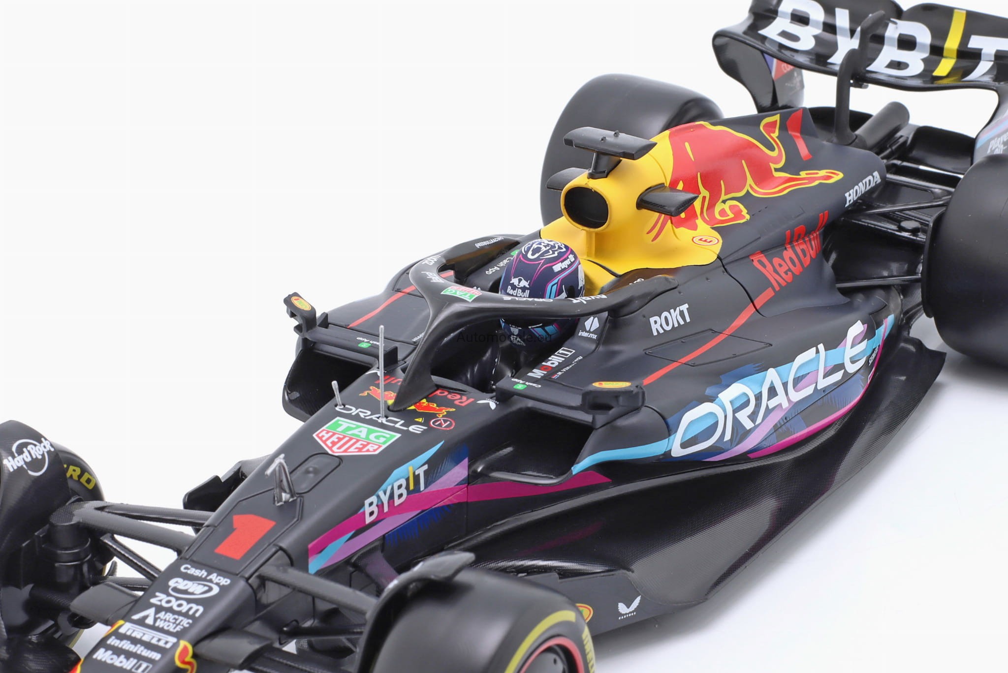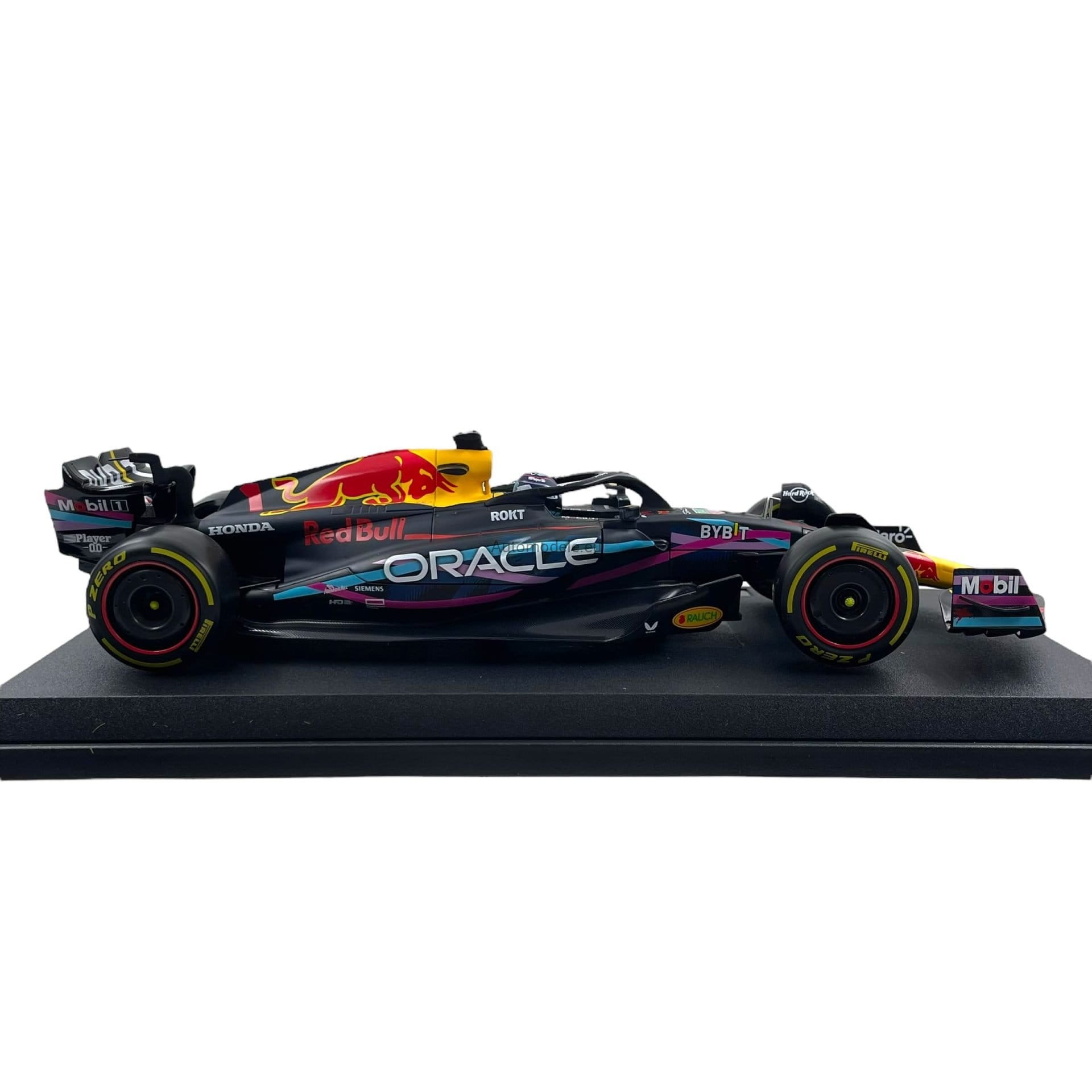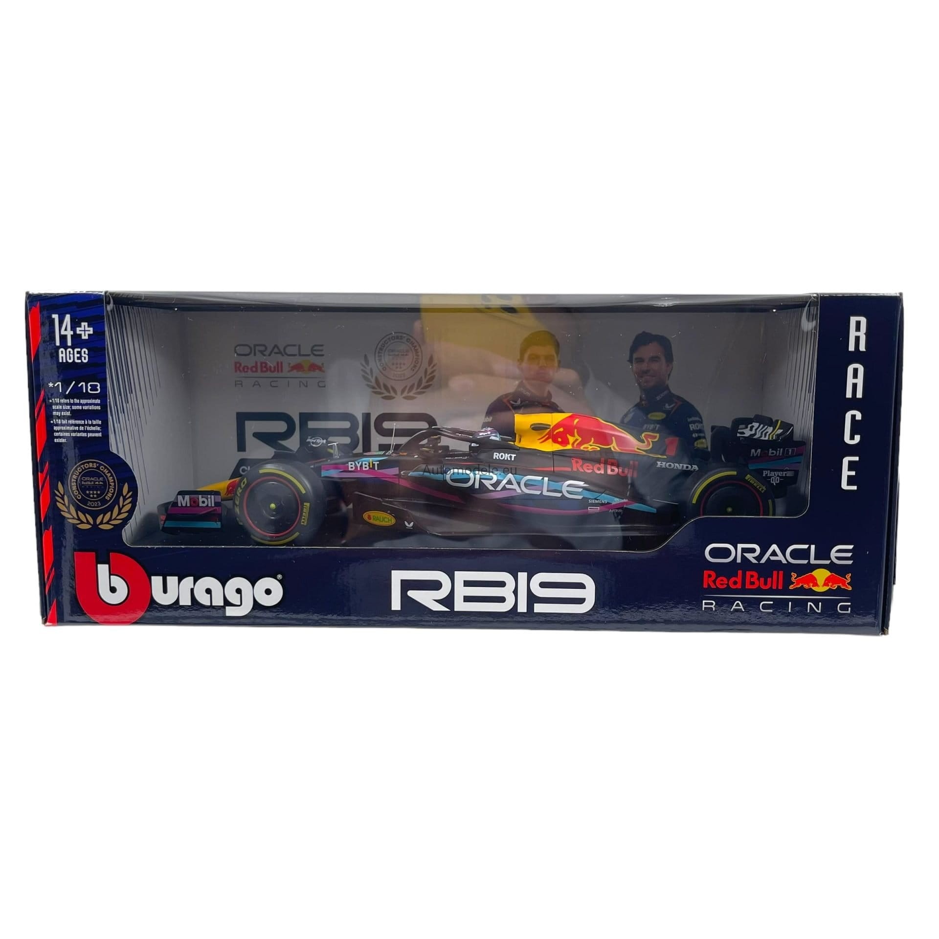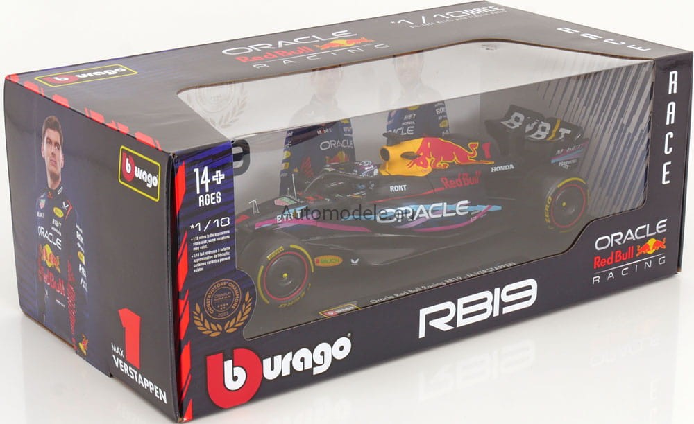 Kolekcjonerski model bolidu Red Bull Racing RB19 #1 Max M. Verstappen Winner Miami GP Formula 1 F1 World Champion z 2023 roku w skali 1/18 wyprodukowany przez firmę Bburago