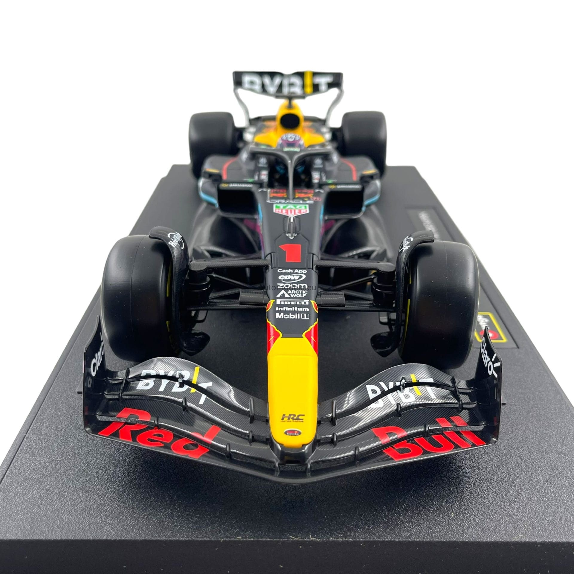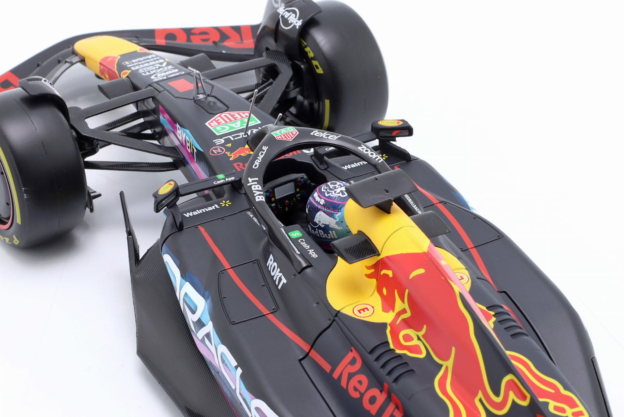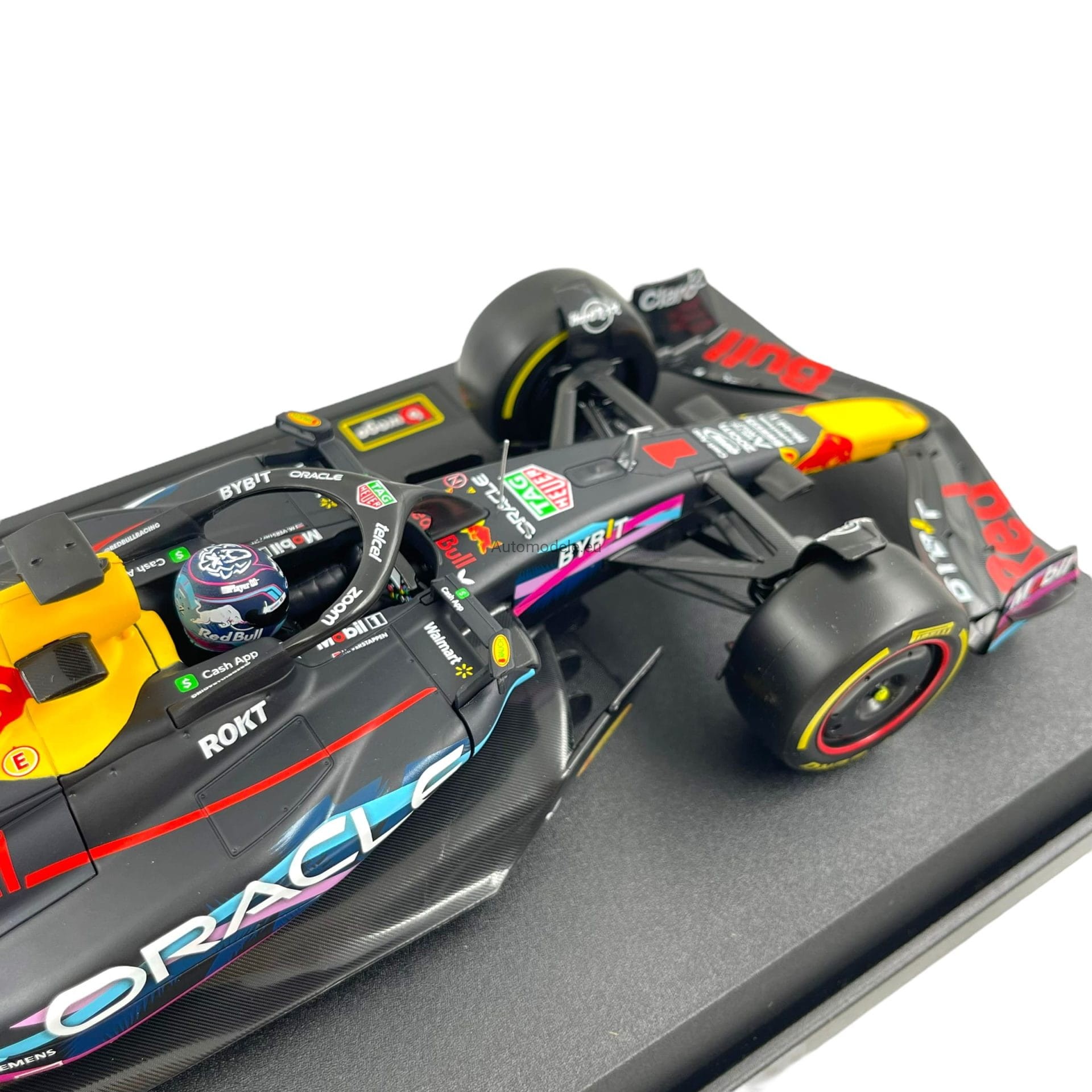 Kolekcjonerski model bolidu Red Bull Racing RB19 #1 Max M. Verstappen Winner Miami GP Formula 1 F1 World Champion z 2023 roku w skali 1/18 wyprodukowany przez firmę Bburago
