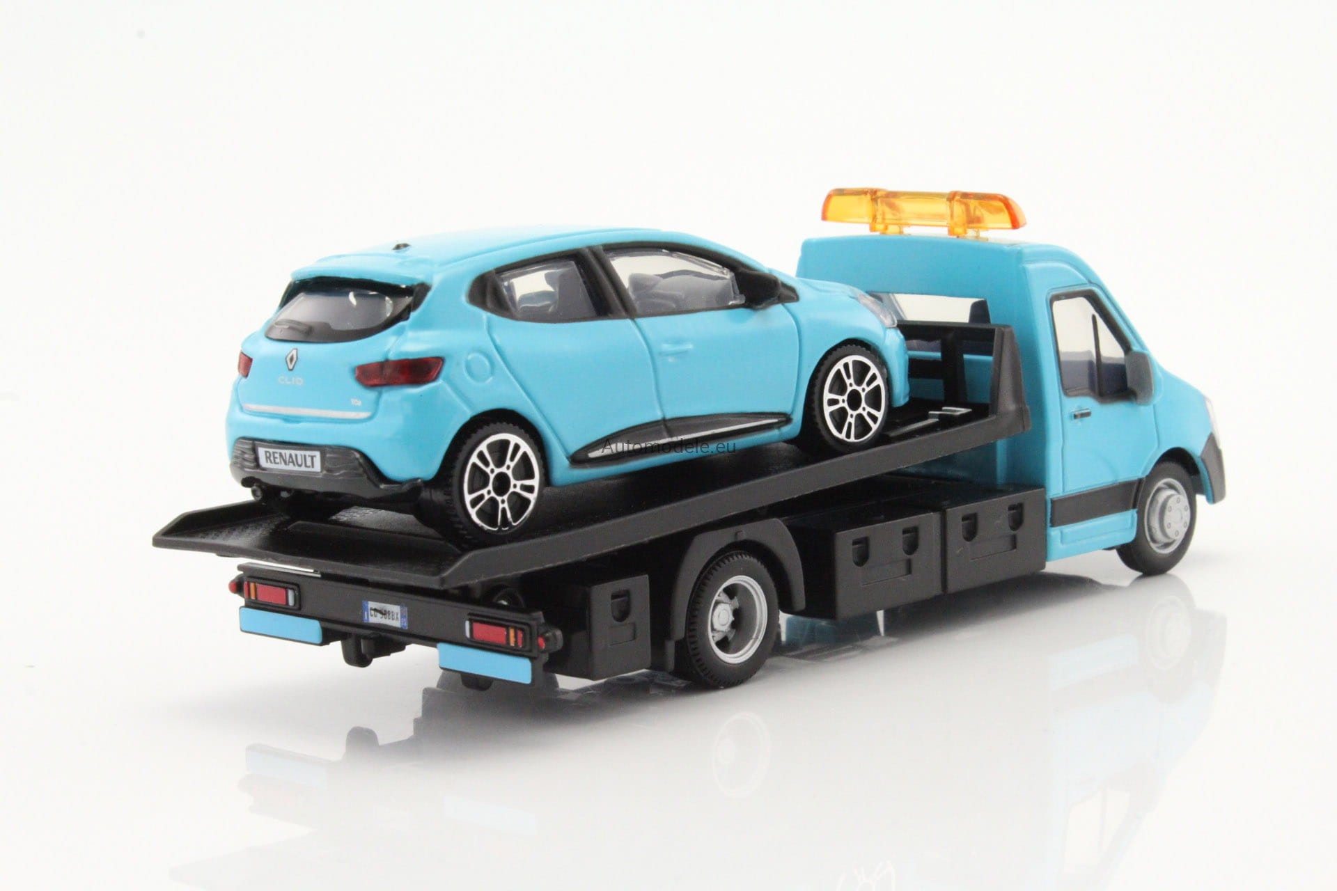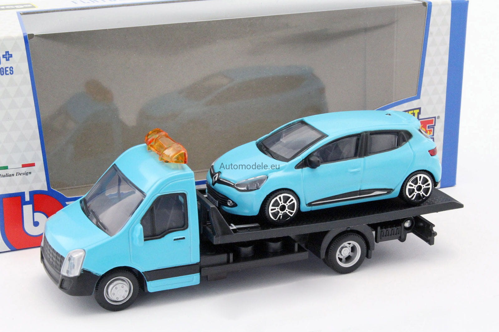 Model samochodu Renault Clio z Autolawetą w skali 1:43 od Bburago. Numer katalogowy: 31401
