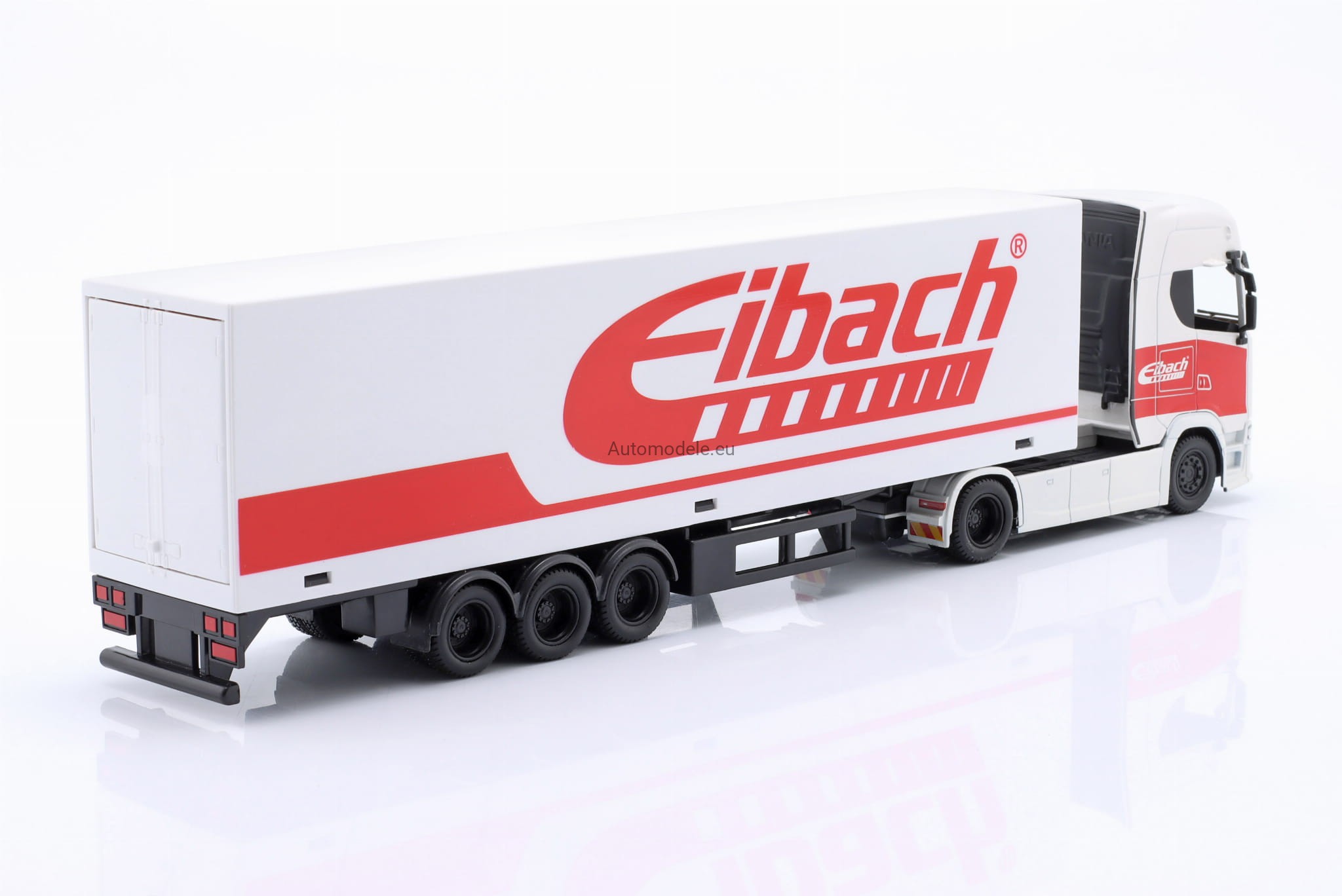 Model samochodu Tir Ciągnik z naczepą Scania 770S 770 S Hauler & Trailer Container Eibach + Naczepa w skali 1:43 od Bburago