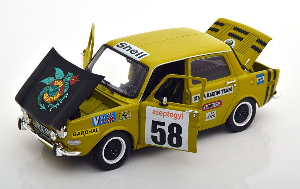 Kolekcjonerski metalowy model samochodu Simca 1000 Rallye 2 SRT #58 z 1973 roku w skali 1:18 od Norev. Numer katalogowy: 185699