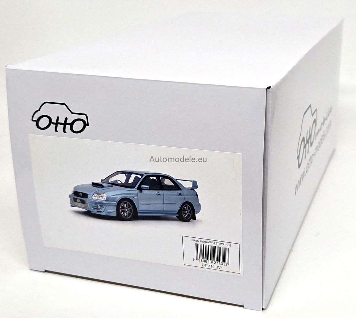 Kolekcjonerski model samochodu Subaru Impreza WRX Sti WR1 P.Solberg Edition - Ice Blue Metallic z 2003 roku w skali 1/18 wyprodukowany przez firmę Otto Mobile / OttOmobile