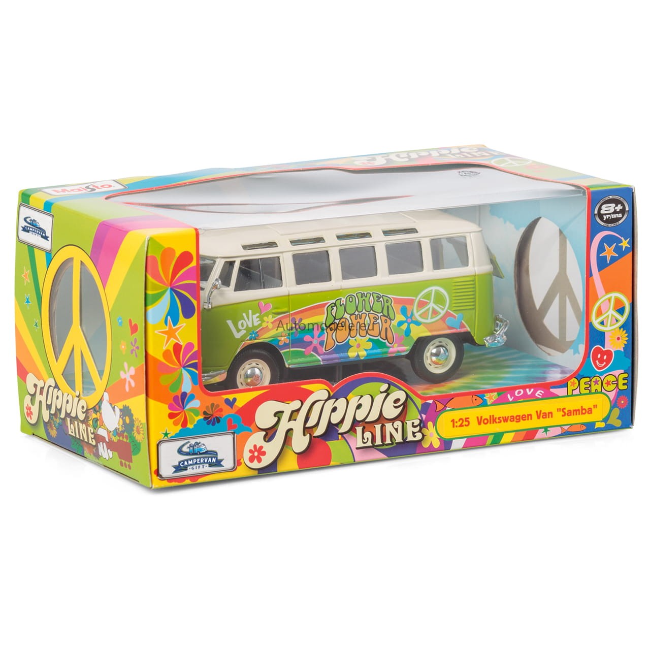 Model samochodu Volkswagen VW T1 Van Samba Bus Hippie Line Flower Power w skali 1:25 od Maisto. Numer katalogowy: 32301